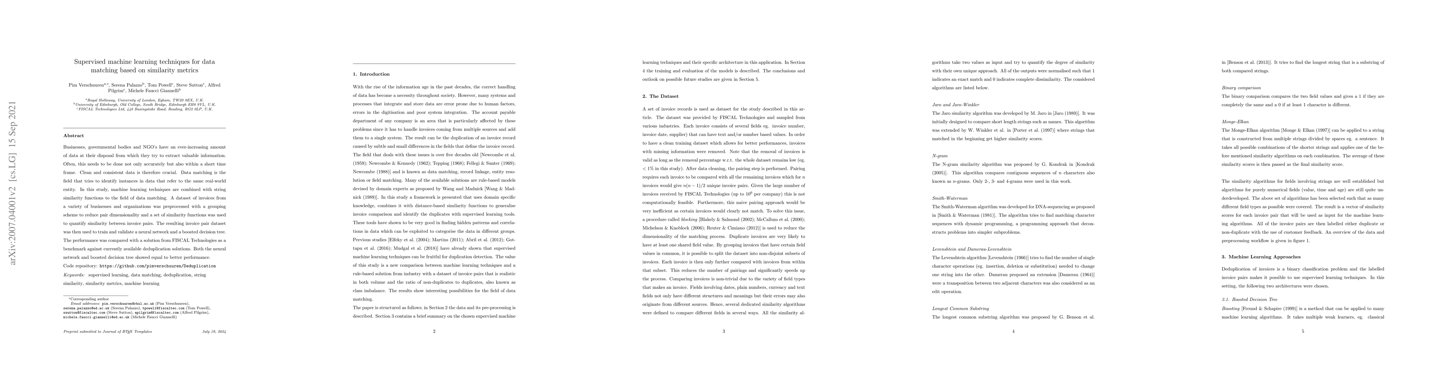 Businesses, governmental bodies and NGO's have an ever-increasing amount of data at their disposal from which they try to extract valuable information. Often, this needs to be done not only accurately but also within a short time frame. Clean and consistent data is therefore crucial. Data matching is the field that tries to identify instances in data that refer to the same real-world entity. In this study, machine learning techniques are combined with string similarity functions to the field of data matching. A dataset of invoices from a variety of businesses and organizations was preprocessed with a grouping scheme to reduce pair dimensionality and a set of similarity functions was used to quantify similarity between invoice pairs. The resulting invoice pair dataset was then used to train and validate a neural network and a boosted decision tree. The performance was compared with a solution from FISCAL Technologies as a benchmark against currently available deduplication solutions. Both the neural network and boosted decision tree showed equal to better performance.