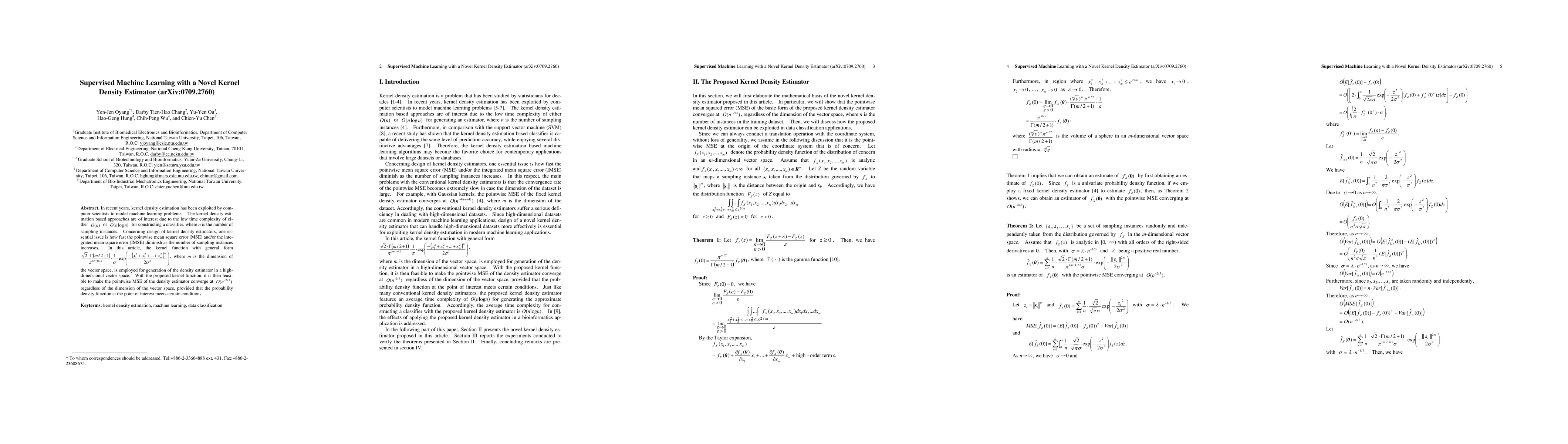 This paper introduces a novel kernel density estimator for supervised machine learning, demonstrating that it achieves a pointwise mean square error convergence rate of O(n^-2/3) for any vector space dimension, under specific conditions on the probability density function. The proposed method ensures low time complexity for classifier construction, making it efficient for large datasets.