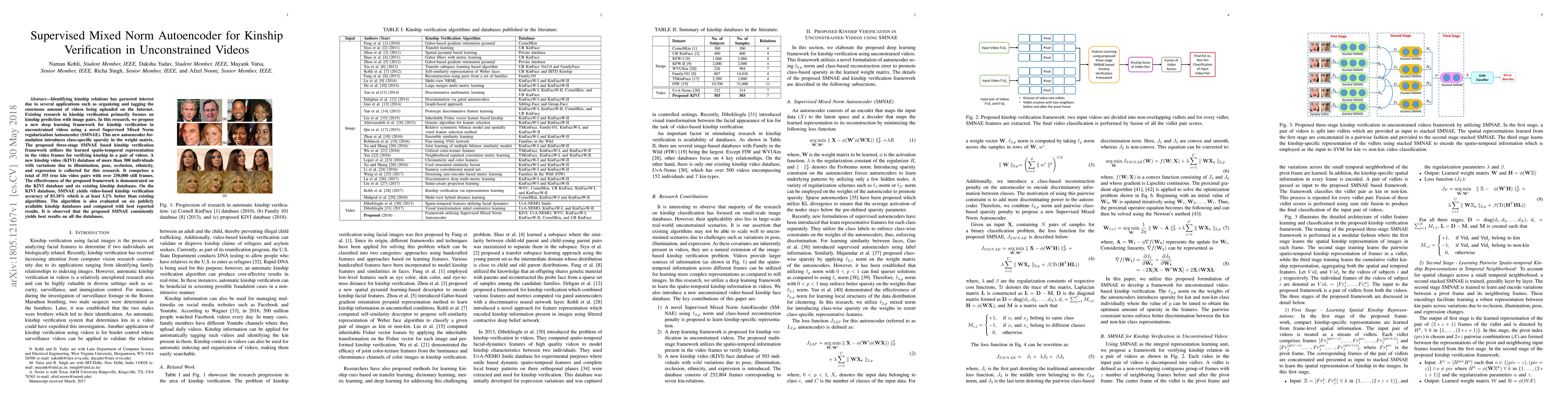 This paper proposes a Supervised Mixed Norm regularization Autoencoder (SMNAE) for verifying kinship relations in unconstrained videos, achieving higher accuracy than existing methods. The framework utilizes a new database, KIVI, with diverse video variations, and demonstrates superior performance across multiple kinship databases.