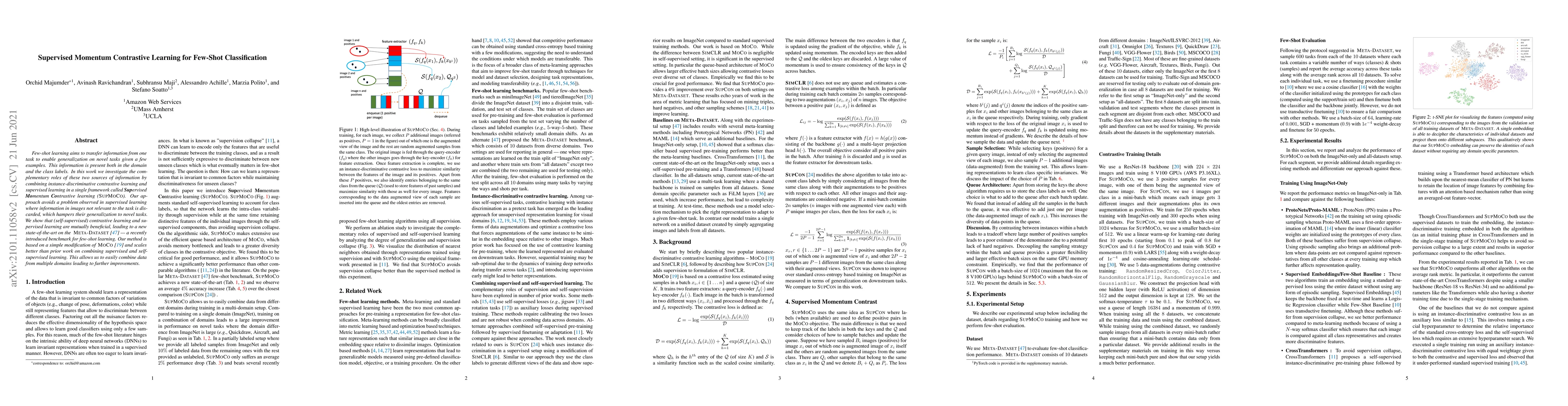 Few-shot learning aims to transfer information from one task to enable generalization on novel tasks given a few examples. This information is present both in the domain and the class labels. In this work we investigate the complementary roles of these two sources of information by combining instance-discriminative contrastive learning and supervised learning in a single framework called Supervised Momentum Contrastive learning (SUPMOCO). Our approach avoids a problem observed in supervised learning where information in images not relevant to the task is discarded, which hampers their generalization to novel tasks. We show that (self-supervised) contrastive learning and supervised learning are mutually beneficial, leading to a new state-of-the-art on the META-DATASET - a recently introduced benchmark for few-shot learning. Our method is based on a simple modification of MOCO and scales better than prior work on combining supervised and self-supervised learning. This allows us to easily combine data from multiple domains leading to further improvements.