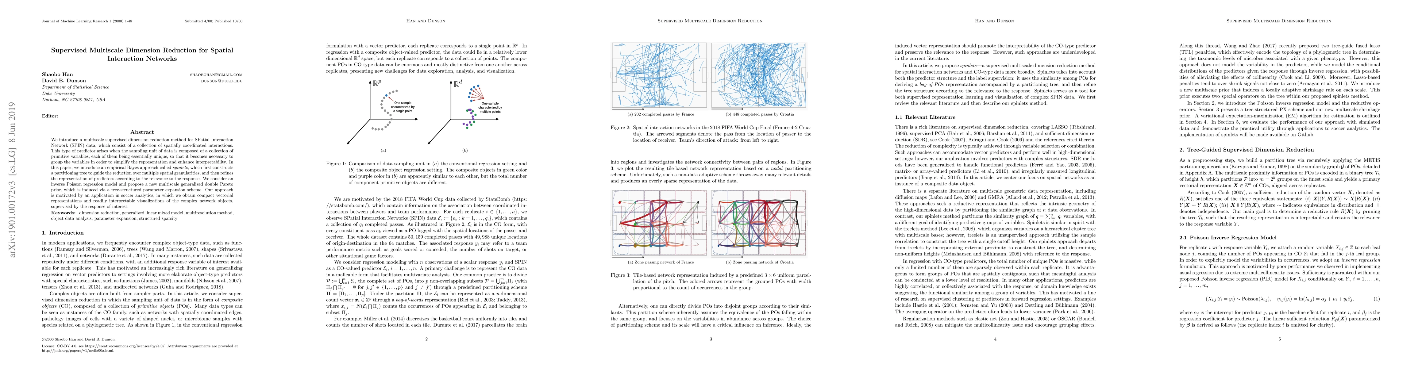 We introduce a multiscale supervised dimension reduction method for SPatial Interaction Network (SPIN) data, which consist of a collection of spatially coordinated interactions. This type of predictor arises when the sampling unit of data is composed of a collection of primitive variables, each of them being essentially unique, so that it becomes necessary to group the variables in order to simplify the representation and enhance interpretability. In this paper, we introduce an empirical Bayes approach called spinlets, which first constructs a partitioning tree to guide the reduction over multiple spatial granularities, and then refines the representation of predictors according to the relevance to the response. We consider an inverse Poisson regression model and propose a new multiscale generalized double Pareto prior, which is induced via a tree-structured parameter expansion scheme. Our approach is motivated by an application in soccer analytics, in which we obtain compact vectorial representations and readily interpretable visualizations of the complex network objects, supervised by the response of interest.