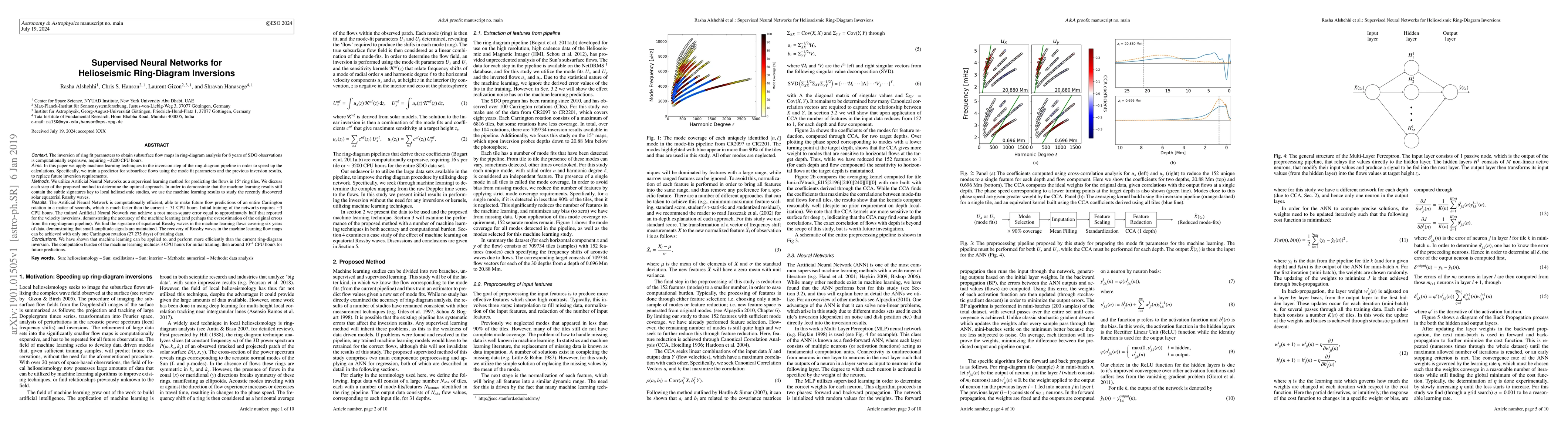 This paper applies supervised neural networks to accelerate helioseismic ring-diagram inversions, reducing the computational cost from 3200 CPU hours to seconds per prediction. The trained Artificial Neural Network maintains the accuracy and recovers small-amplitude solar equatorial Rossby waves, demonstrating its efficiency and effectiveness.