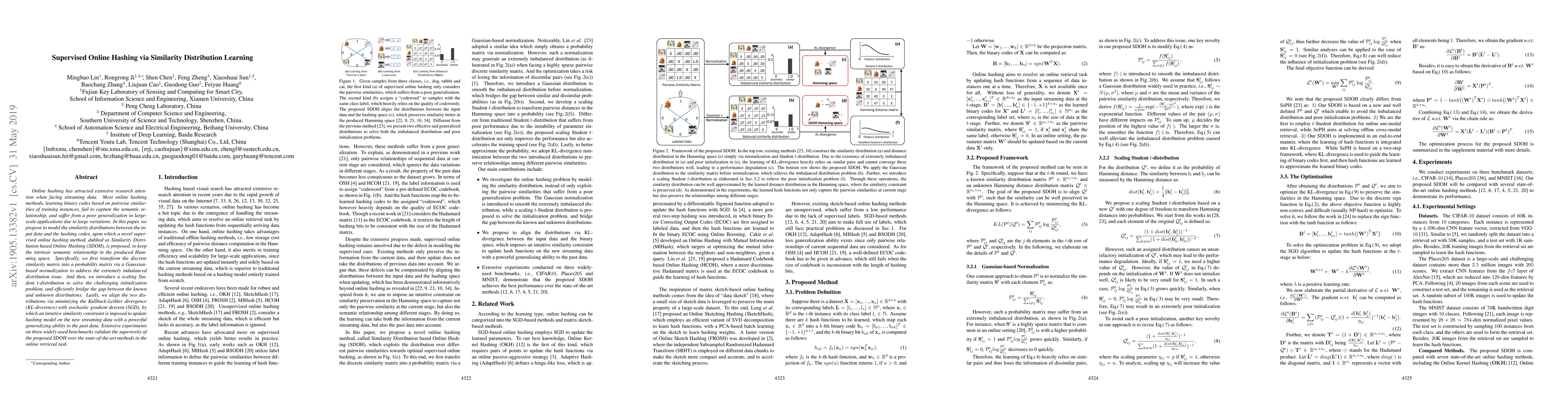 This paper proposes a supervised online hashing method called Similarity Distribution based Online Hashing (SDOH) to improve generalization in large-scale applications. It models similarity distributions between data and hashing codes, addressing initialization and distribution imbalance issues, and aligns distributions via minimizing Kullback-Leibler divergence, demonstrating superior performance in online retrieval tasks.