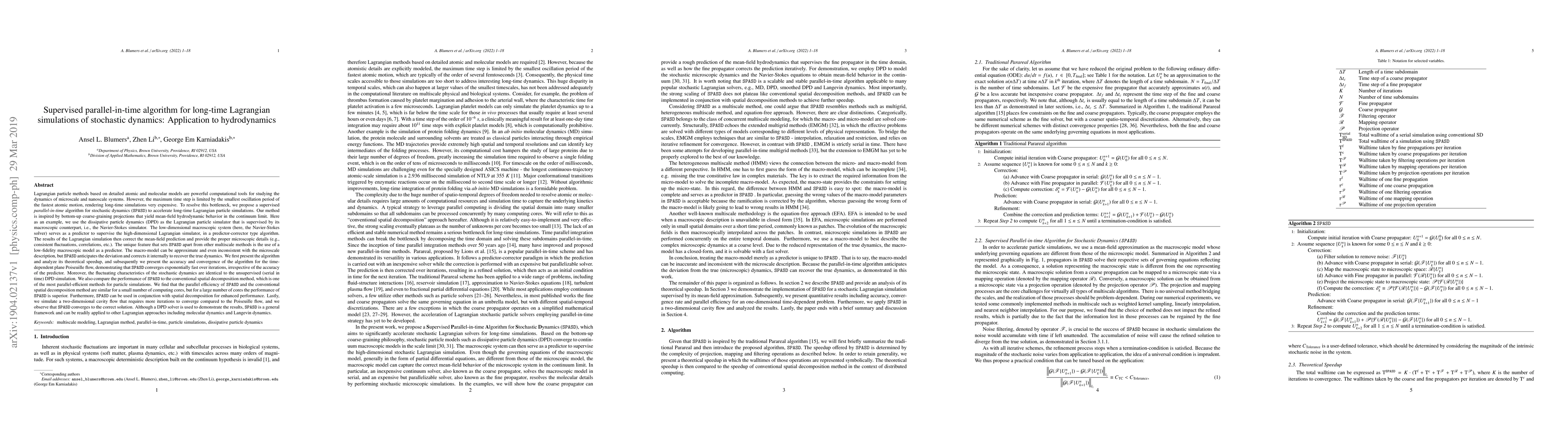 A new method called Supervised Parallel-In-Time Algorithm for Stochastic Dynamics (SPASD) accelerates long-time Lagrangian particle simulations of stochastic dynamics, using a low-fidelity macroscopic model as a predictor to correct the simulation.