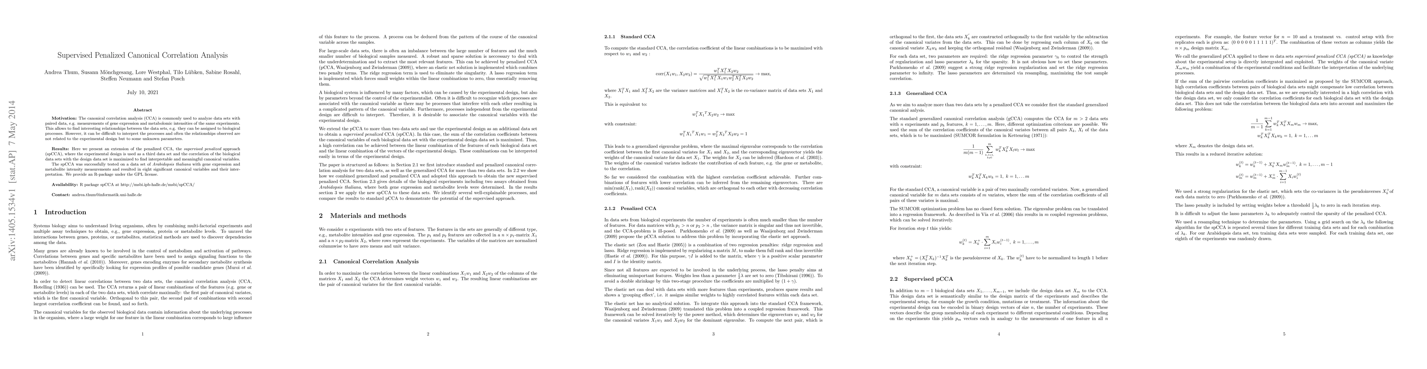 This paper introduces supervised penalized canonical correlation analysis (spCCA), an extension of CCA that uses experimental design as a third data set to maximize the correlation with biological data, resulting in more interpretable canonical variables. The method was tested on Arabidopsis thaliana data, yielding significant and meaningful canonical variables.