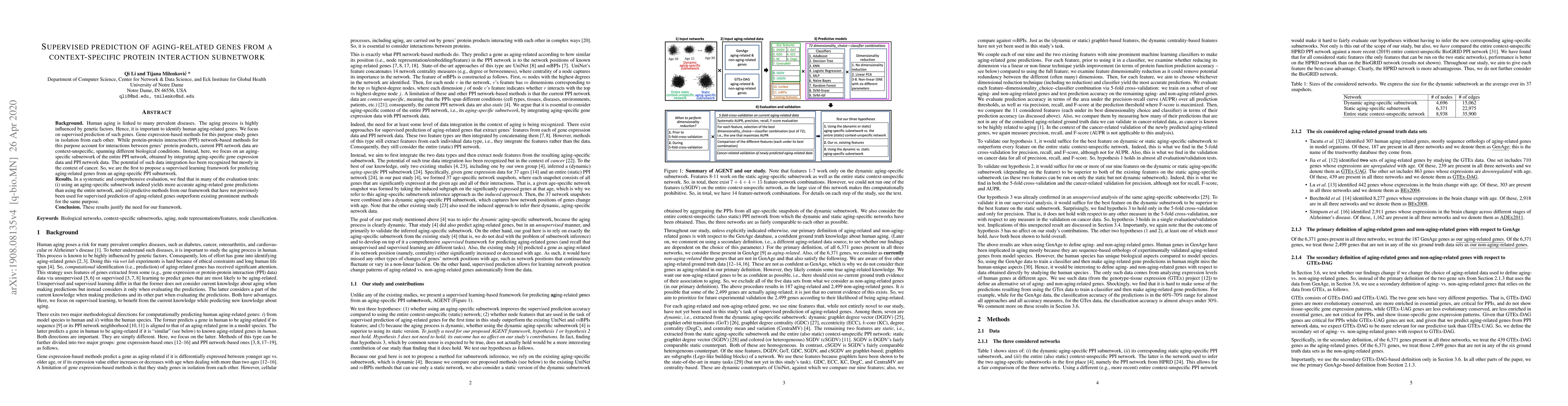 This paper proposes a supervised learning framework for predicting aging-related genes using an aging-specific protein interaction subnetwork, which integrates aging-specific gene expression data and context-specific PPI data. The evaluation shows that this approach yields more accurate predictions than using the entire PPI network and outperforms existing methods.