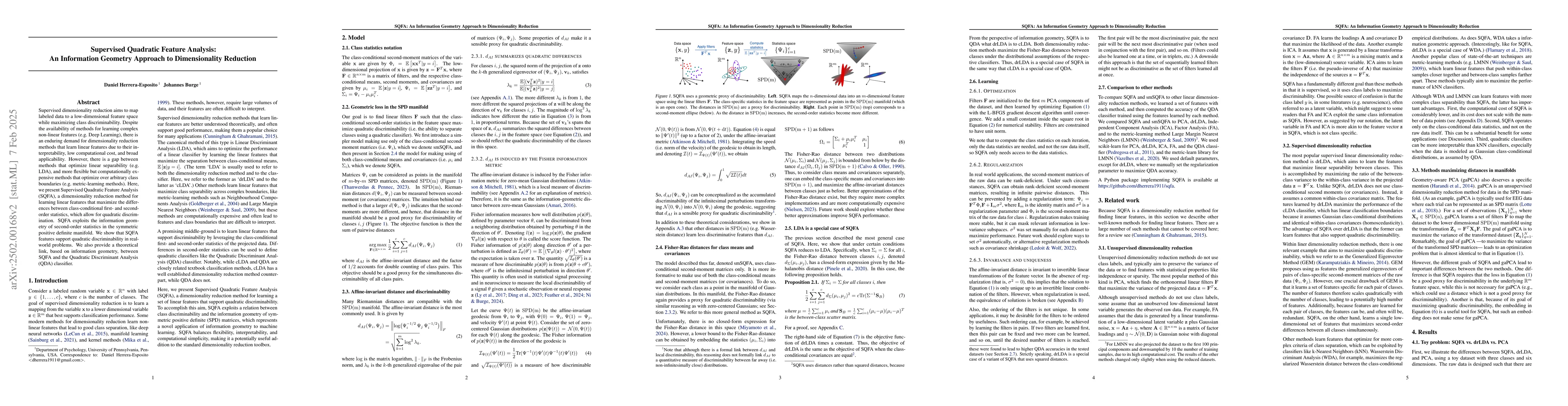 The research introduces Supervised Quadratic Feature Analysis (SQFA), a dimensionality reduction method that learns linear features maximizing the differences between class-conditional first- and second-order statistics for quadratic discriminability. It exploits the information geometry of second-order statistics in the symmetric positive definite manifold and establishes a theoretical link with Quadratic Discriminant Analysis (QDA) classifier.