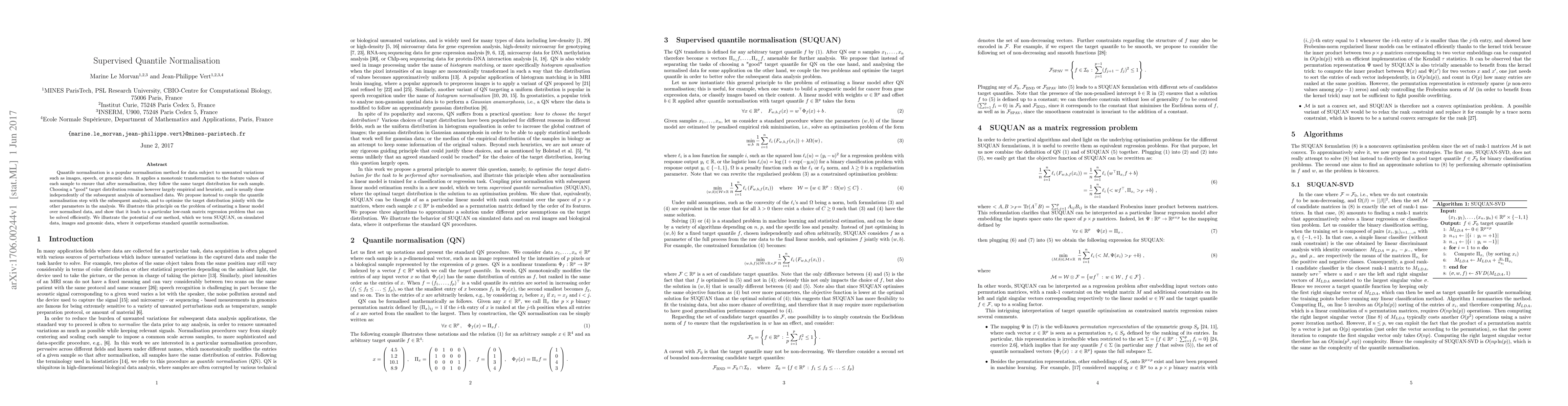 Quantile normalisation is a popular normalisation method for data subject to unwanted variations such as images, speech, or genomic data. It applies a monotonic transformation to the feature values of each sample to ensure that after normalisation, they follow the same target distribution for each sample. Choosing a "good" target distribution remains however largely empirical and heuristic, and is usually done independently of the subsequent analysis of normalised data. We propose instead to couple the quantile normalisation step with the subsequent analysis, and to optimise the target distribution jointly with the other parameters in the analysis. We illustrate this principle on the problem of estimating a linear model over normalised data, and show that it leads to a particular low-rank matrix regression problem that can be solved efficiently. We illustrate the potential of our method, which we term SUQUAN, on simulated data, images and genomic data, where it outperforms standard quantile normalisation.