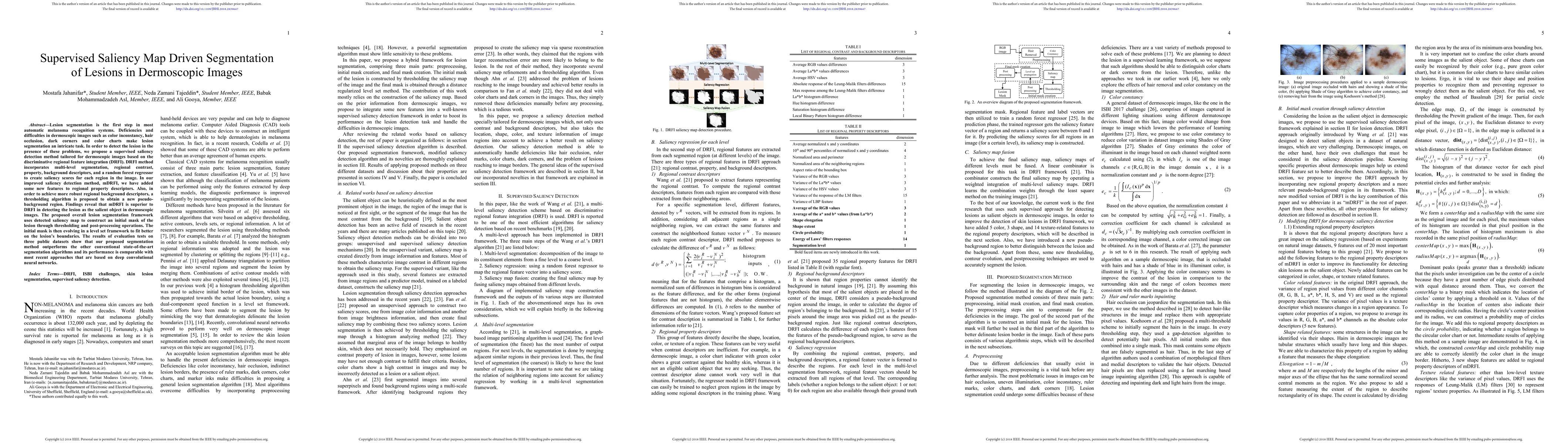 This paper proposes a supervised saliency detection method, mDRFI, for segmenting lesions in dermoscopic images, incorporating enhanced regional features and a pseudo-background region. The method outperforms conventional algorithms and is competitive with recent deep learning-based approaches.
