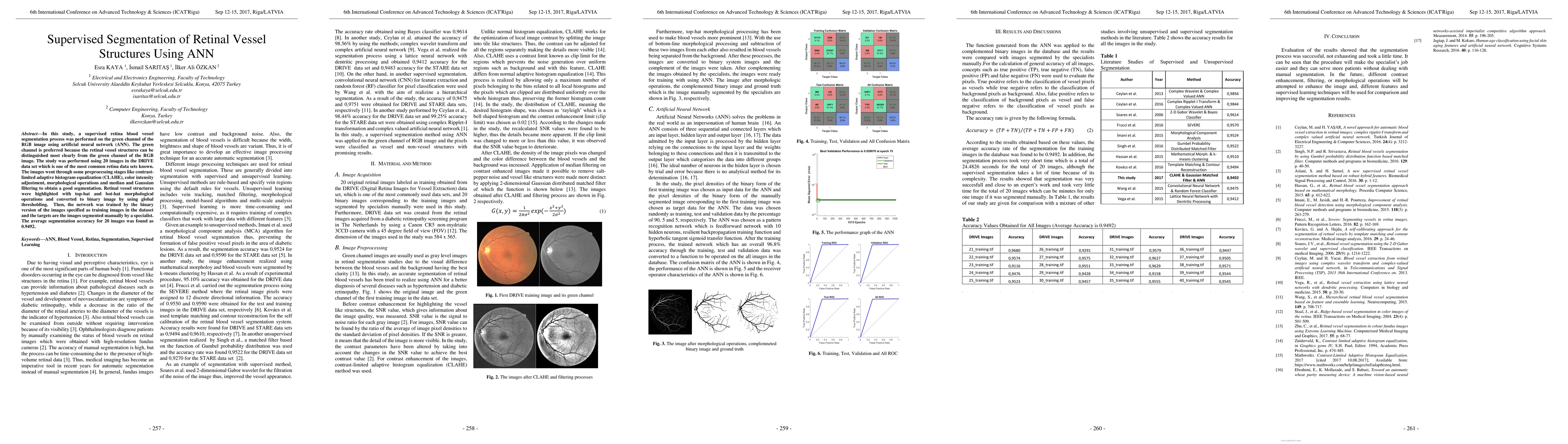 In this study, a supervised retina blood vessel segmentation process was performed on the green channel of the RGB image using artificial neural network (ANN). The green channel is preferred because the retinal vessel structures can be distinguished most clearly from the green channel of the RGB image. The study was performed using 20 images in the DRIVE data set which is one of the most common retina data sets known. The images went through some preprocessing stages like contrastlimited adaptive histogram equalization (CLAHE), color intensity adjustment, morphological operations and median and Gaussian filtering to obtain a good segmentation. Retinal vessel structures were highlighted with top-hat and bot-hat morphological operations and converted to binary image by using global thresholding. Then, the network was trained by the binary version of the images specified as training images in the dataset and the targets are the images segmented manually by a specialist. The average segmentation accuracy for 20 images was found as 0.9492.