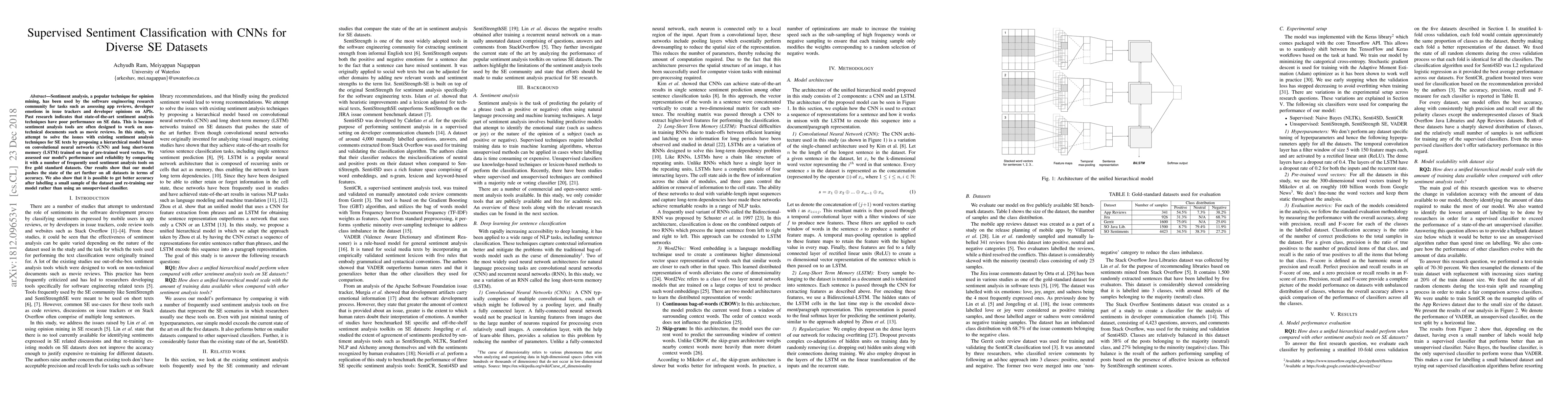 Sentiment analysis, a popular technique for opinion mining, has been used by the software engineering research community for tasks such as assessing app reviews, developer emotions in issue trackers and developer opinions on APIs. Past research indicates that state-of-the-art sentiment analysis techniques have poor performance on SE data. This is because sentiment analysis tools are often designed to work on non-technical documents such as movie reviews. In this study, we attempt to solve the issues with existing sentiment analysis techniques for SE texts by proposing a hierarchical model based on convolutional neural networks (CNN) and long short-term memory (LSTM) trained on top of pre-trained word vectors. We assessed our model's performance and reliability by comparing it with a number of frequently used sentiment analysis tools on five gold standard datasets. Our results show that our model pushes the state of the art further on all datasets in terms of accuracy. We also show that it is possible to get better accuracy after labelling a small sample of the dataset and re-training our model rather than using an unsupervised classifier.