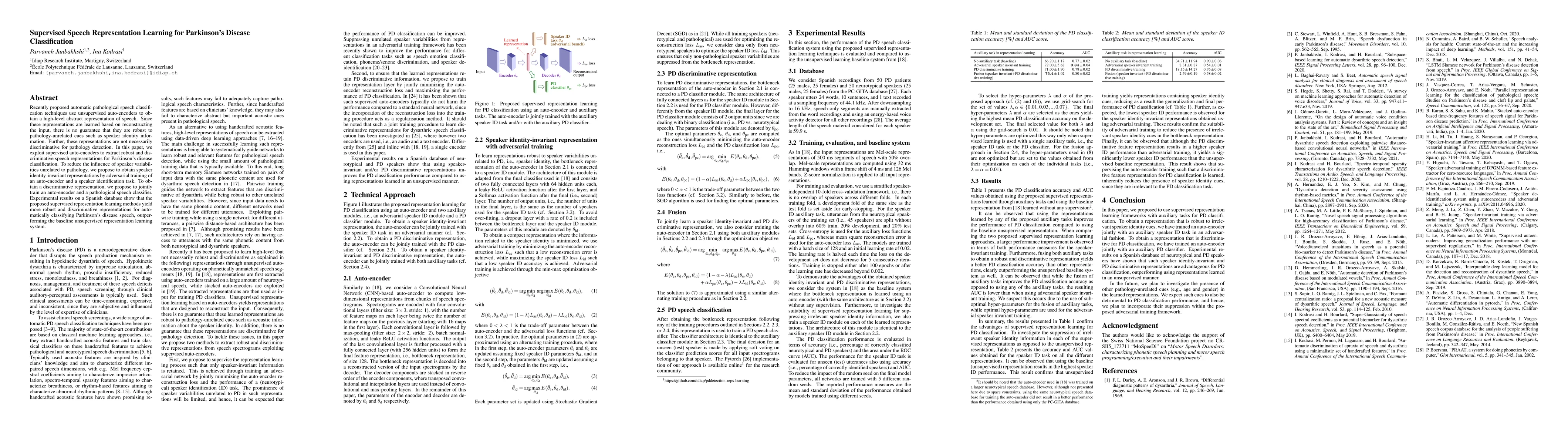 This paper proposes supervised auto-encoders for robust and discriminative speech representation learning to classify Parkinson's disease. The method uses adversarial training to minimize speaker identity effects and jointly trains an auto-encoder with a classifier, achieving better performance than unsupervised baselines.