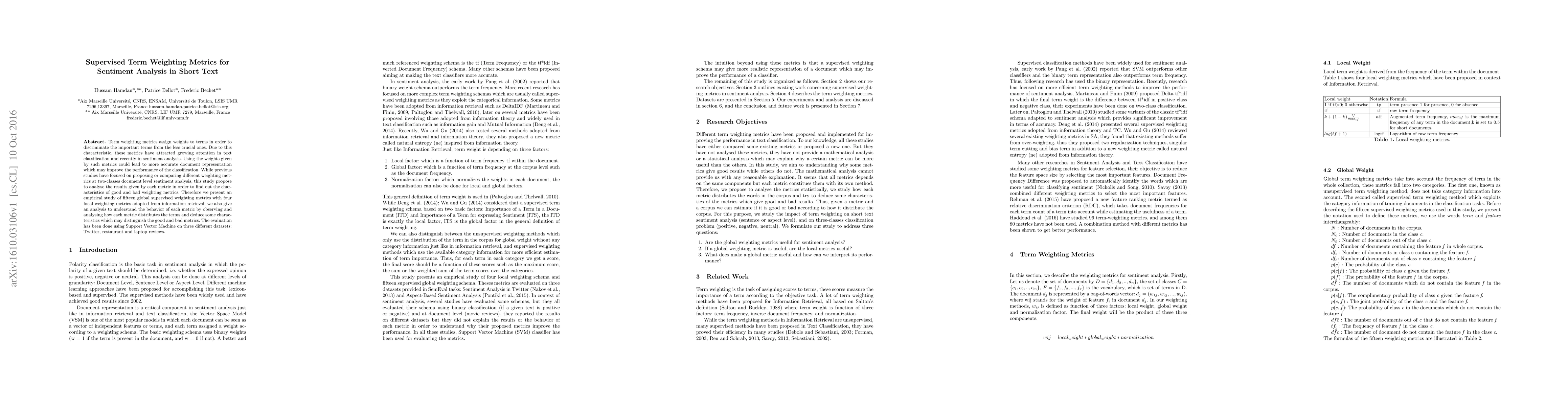 This study investigates the performance of supervised term weighting metrics in sentiment analysis for short texts, comparing fifteen global and four local metrics. The research aims to identify characteristics that distinguish effective from ineffective metrics through an empirical analysis using Support Vector Machine classification on Twitter, restaurant, and laptop review datasets.