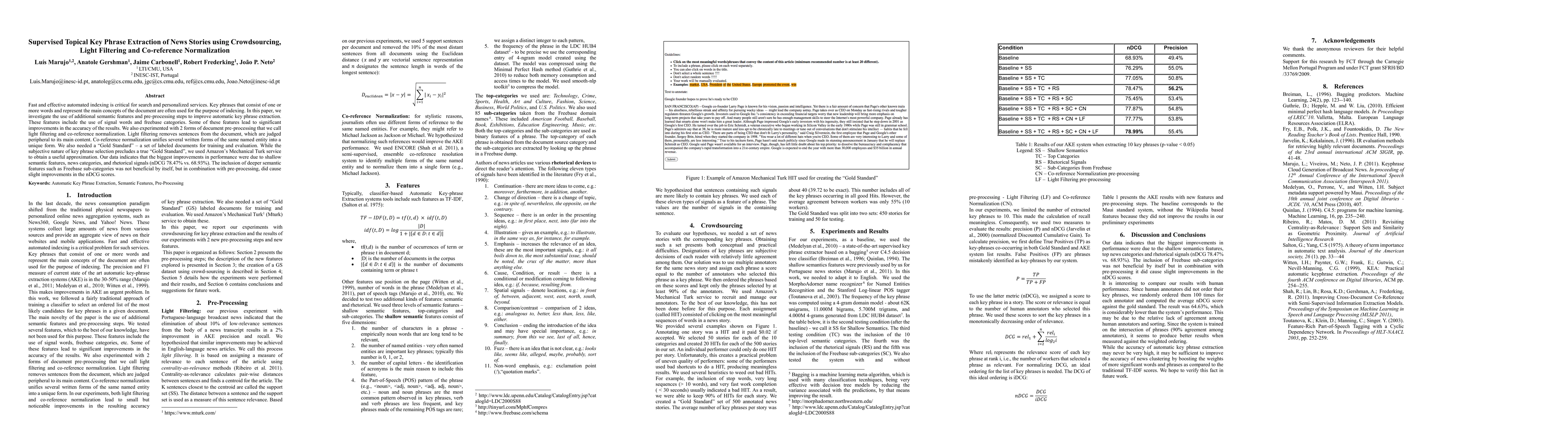 This paper explores enhanced automatic key phrase extraction for news stories using crowdsourcing, light filtering, and co-reference normalization. The study finds significant improvements in accuracy through semantic features like signal words and Freebase categories, with the best results achieved by combining shallow semantic features and pre-processing techniques.