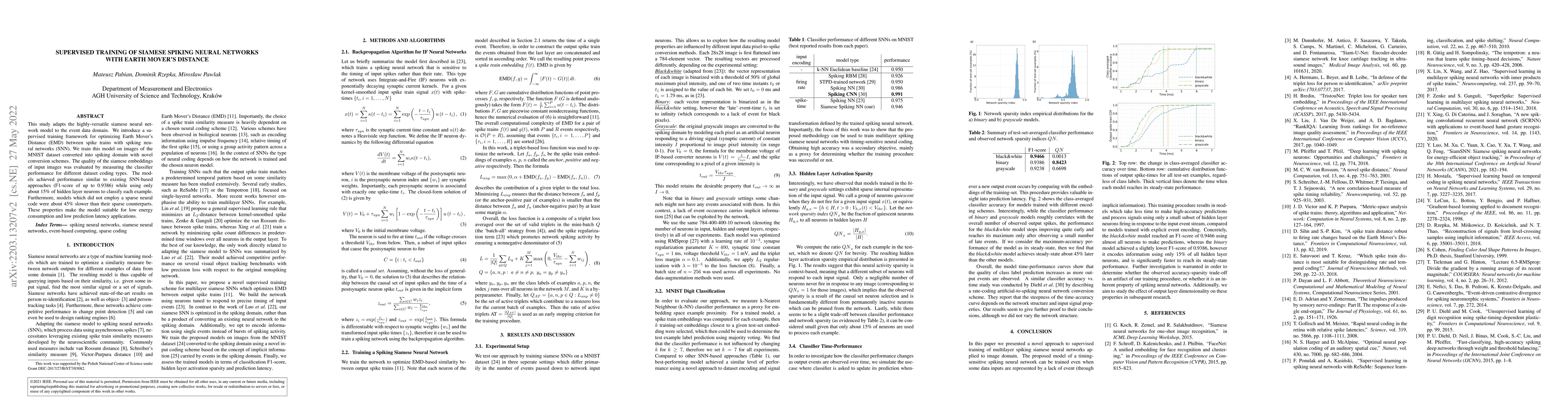 This paper presents a supervised training framework for siamese spiking neural networks using Earth Mover's Distance to optimize spike train comparisons. The model achieves high classification performance on MNIST images, demonstrating low energy consumption and latency, suitable for resource-constrained applications.