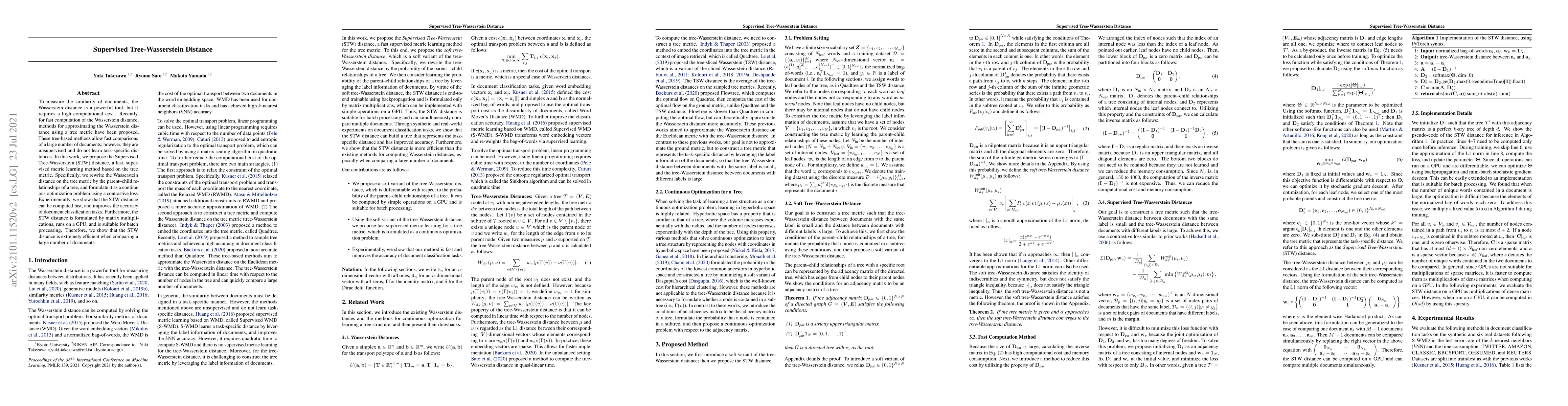 The Supervised Tree-Wasserstein (STW) distance is a fast, supervised metric learning method that approximates the Wasserstein distance using a tree metric, improving document classification accuracy while maintaining computational efficiency through GPU-based matrix multiplications. The STW distance is formulated as a continuous optimization problem using a contrastive loss.