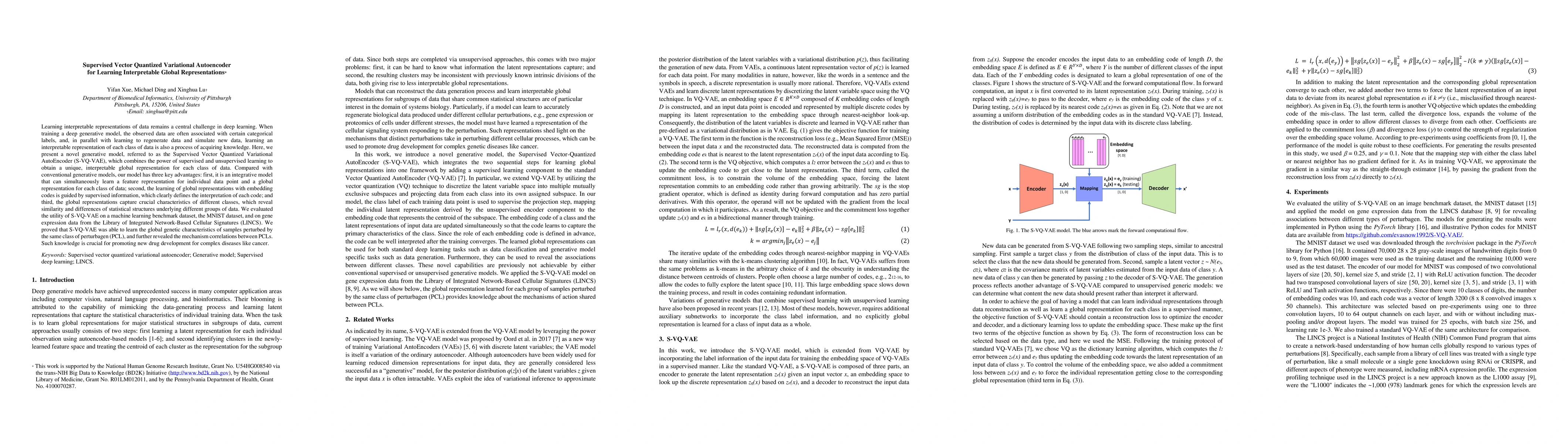 Learning interpretable representations of data remains a central challenge in deep learning. When training a deep generative model, the observed data are often associated with certain categorical labels, and, in parallel with learning to regenerate data and simulate new data, learning an interpretable representation of each class of data is also a process of acquiring knowledge. Here, we present a novel generative model, referred to as the Supervised Vector Quantized Variational AutoEncoder (S-VQ-VAE), which combines the power of supervised and unsupervised learning to obtain a unique, interpretable global representation for each class of data. Compared with conventional generative models, our model has three key advantages: first, it is an integrative model that can simultaneously learn a feature representation for individual data point and a global representation for each class of data; second, the learning of global representations with embedding codes is guided by supervised information, which clearly defines the interpretation of each code; and third, the global representations capture crucial characteristics of different classes, which reveal similarity and differences of statistical structures underlying different groups of data. We evaluated the utility of S-VQ-VAE on a machine learning benchmark dataset, the MNIST dataset, and on gene expression data from the Library of Integrated Network-Based Cellular Signatures (LINCS). We proved that S-VQ-VAE was able to learn the global genetic characteristics of samples perturbed by the same class of perturbagen (PCL), and further revealed the mechanism correlations between PCLs. Such knowledge is crucial for promoting new drug development for complex diseases like cancer.
