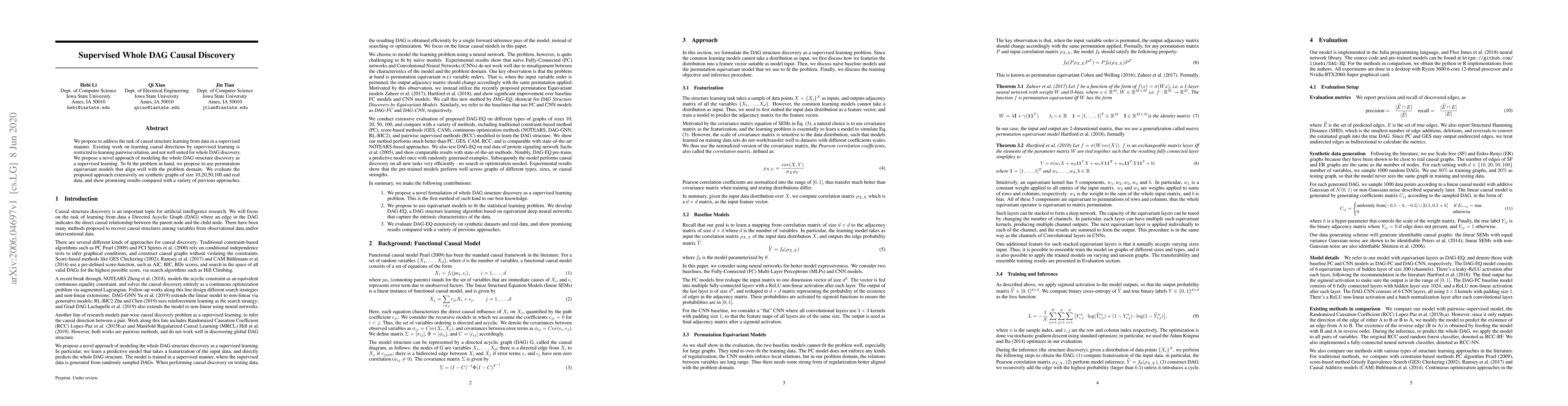 This paper introduces a supervised learning approach for discovering the entire Directed Acyclic Graph (DAG) structure from data, addressing limitations of existing methods that only handle pairwise relations. The proposed method uses permutation equivariant models and demonstrates promising results on both synthetic and real datasets compared to previous techniques.