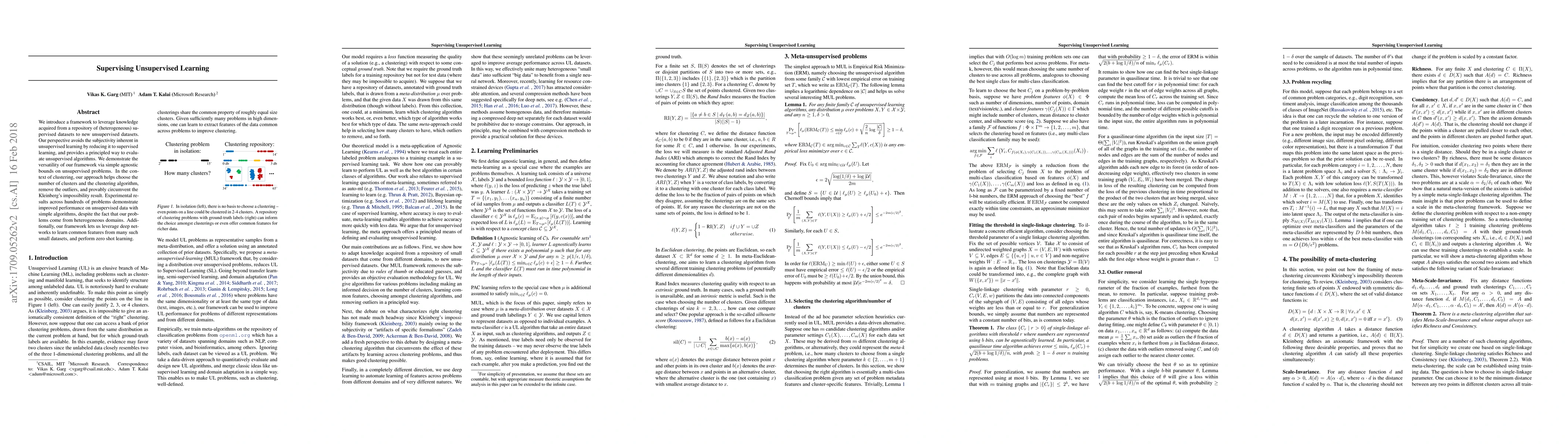 We introduce a framework to leverage knowledge acquired from a repository of (heterogeneous) supervised datasets to new unsupervised datasets. Our perspective avoids the subjectivity inherent in unsupervised learning by reducing it to supervised learning, and provides a principled way to evaluate unsupervised algorithms. We demonstrate the versatility of our framework via simple agnostic bounds on unsupervised problems. In the context of clustering, our approach helps choose the number of clusters and the clustering algorithm, remove the outliers, and provably circumvent the Kleinberg's impossibility result. Experimental results across hundreds of problems demonstrate improved performance on unsupervised data with simple algorithms, despite the fact that our problems come from heterogeneous domains. Additionally, our framework lets us leverage deep networks to learn common features from many such small datasets, and perform zero shot learning.