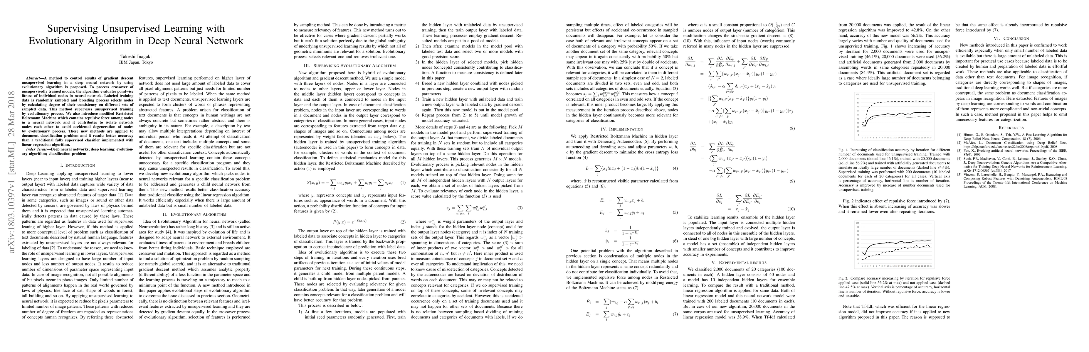 A new method uses evolutionary algorithms to supervise unsupervised learning in deep neural networks, improving accuracy over traditional methods on a document classification task.