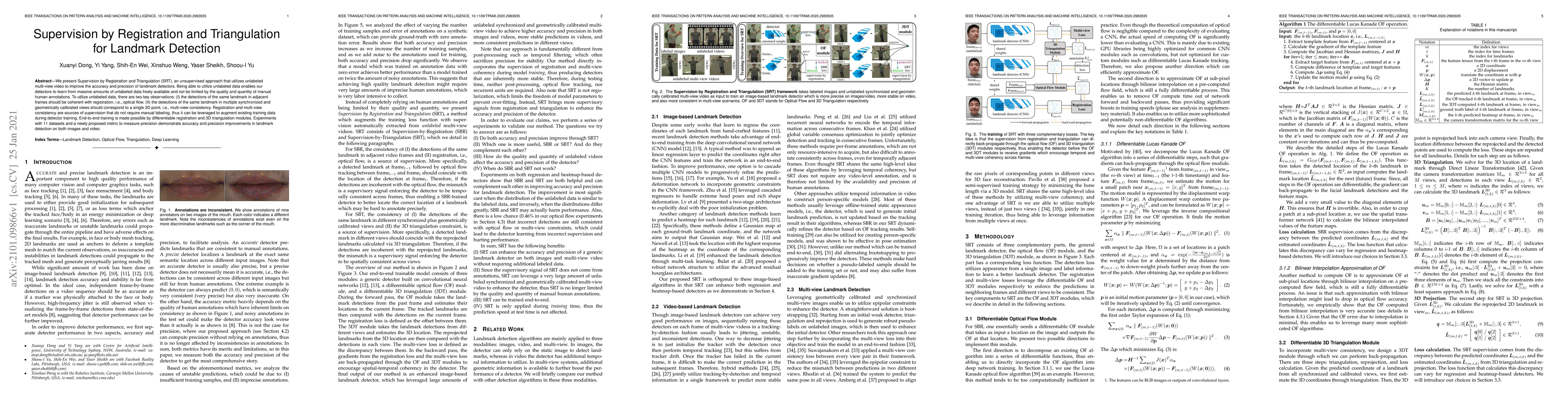 This paper introduces an unsupervised method called Supervision by Registration and Triangulation (SRT) for improving landmark detection accuracy using unlabeled multi-view video. It leverages registration and multi-view consistency to provide supervision without manual annotations, leading to enhanced detector performance across various datasets.