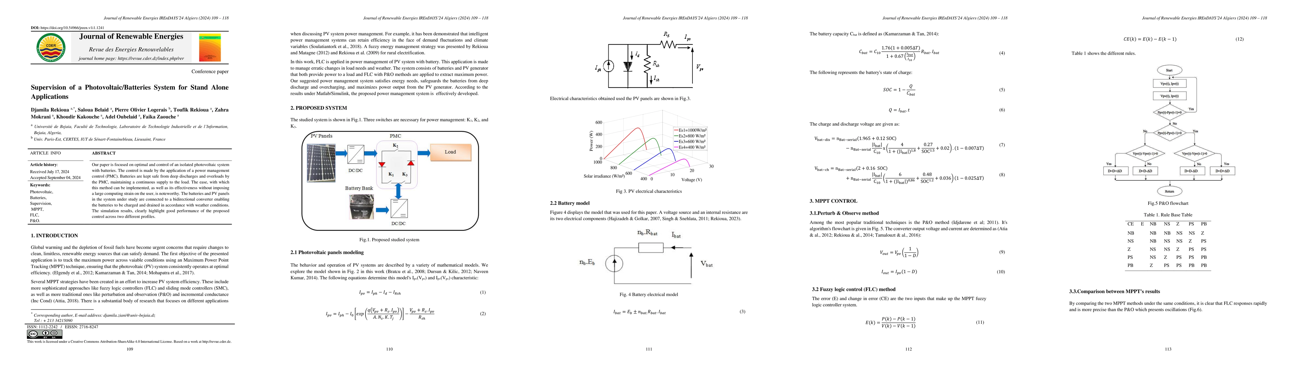 Our paper is focused on optimal and control of an isolated photovoltaic system with batteries. The control is made by the application of a power management control (PMC). Batteries are kept safe from deep discharges and overloads by the PMC, maintaining a continuous supply to the load. The ease, with which this method can be implemented, as well as its effectiveness without imposing a large computing strain on the user, is noteworthy. The batteries and PV panels in the system under study are connected to a bidirectional converter enabling the batteries to be charged and drained in accordance with weather conditions. The simulation results, clearly highlight good performance of the proposed control across two different profiles.