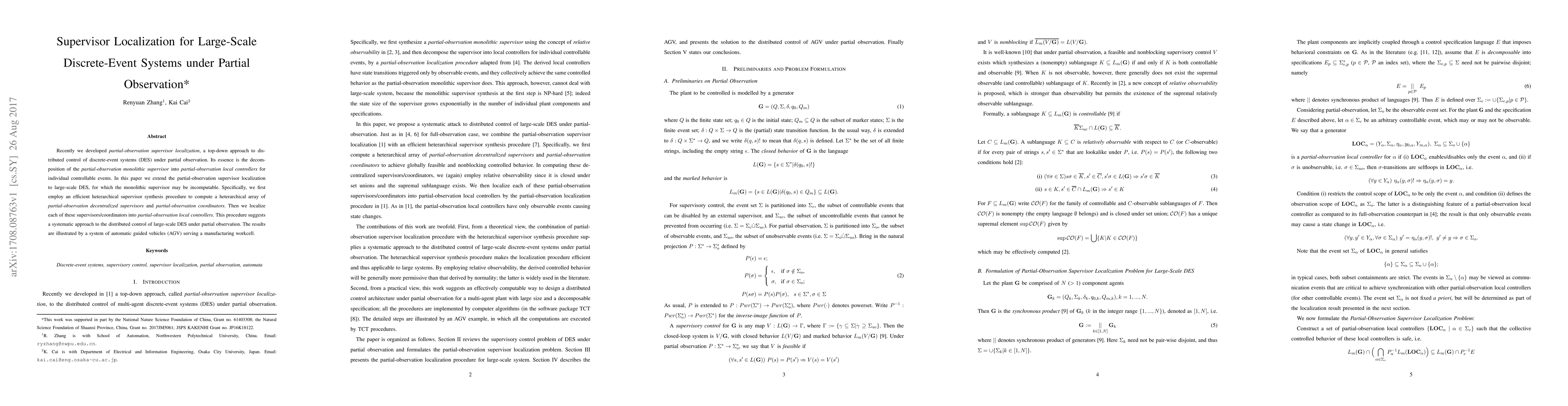 This paper extends the partial-observation supervisor localization technique to large-scale discrete-event systems, employing a heterarchical supervisor synthesis procedure to decompose a potentially incomputable monolithic supervisor into decentralized local controllers. This approach facilitates distributed control in systems like automatic guided vehicles in a manufacturing workcell.