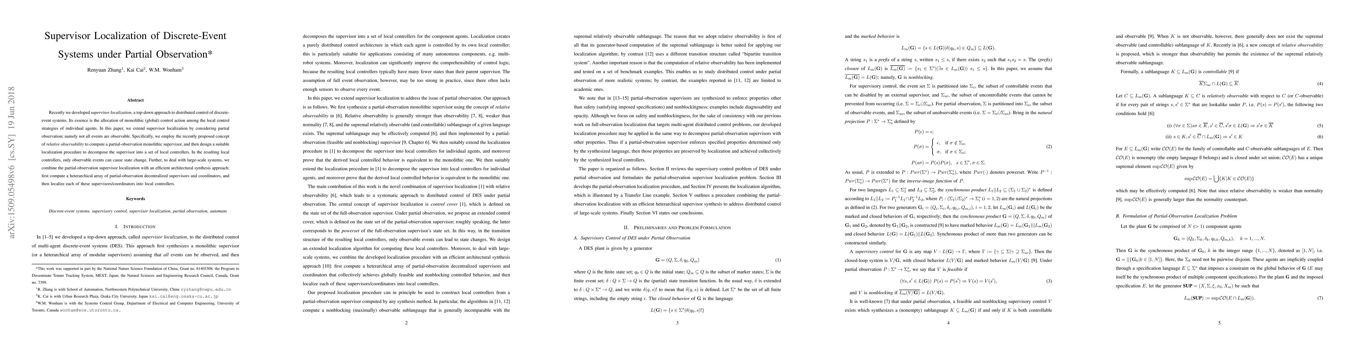 This paper extends supervisor localization to discrete-event systems under partial observation, employing relative observability to compute a partial-observation monolithic supervisor. It introduces a localization procedure to decompose this supervisor into local controllers, ensuring state changes only occur from observable events, and combines this with an efficient architectural synthesis approach for large-scale systems.
