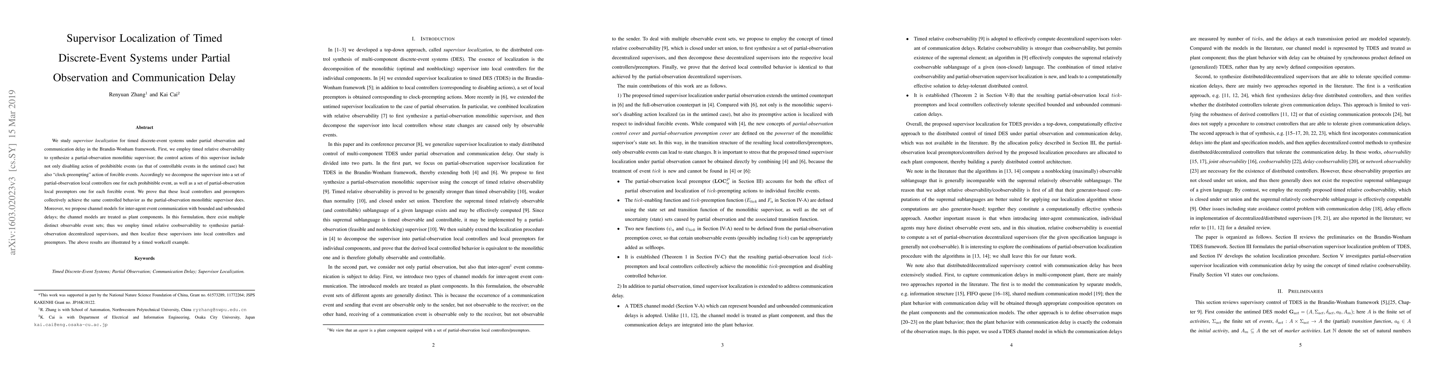 This paper investigates supervisor localization for timed discrete-event systems under partial observation and communication delay. It synthesizes a decentralized supervisor using timed relative observability and coobservability, decomposing it into local controllers and preemptors to achieve the same controlled behavior as the monolithic supervisor.