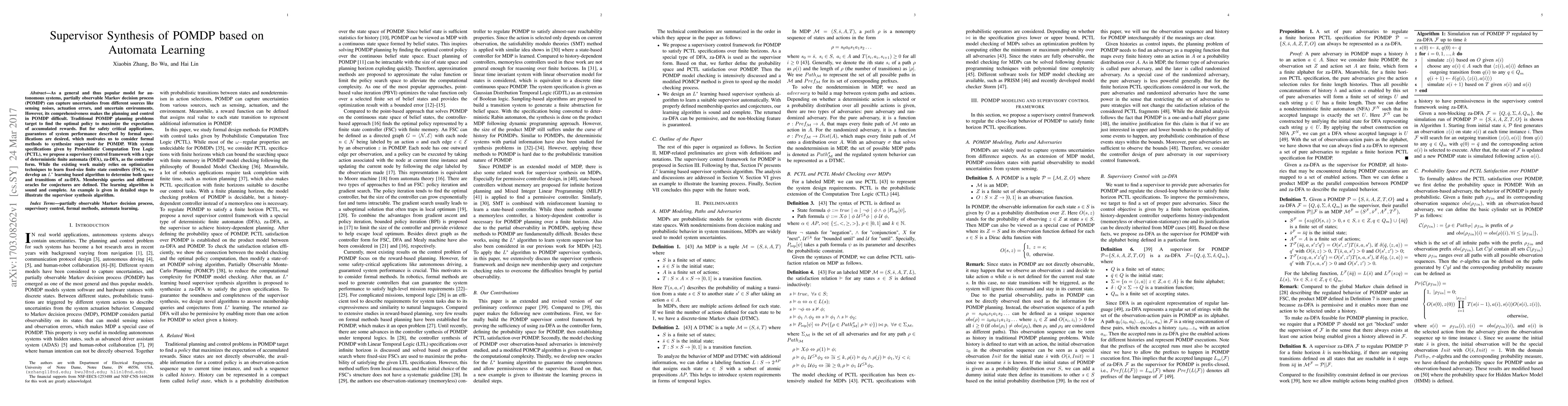 This paper proposes a supervisory control framework for partially observable Markov decision processes (POMDPs) using automata learning, specifically a za-DFA, to synthesize supervisors that meet formal specifications given by Probabilistic Computation Tree Logic (PCTL). It introduces an $L^*$ learning algorithm to determine the structure and transitions of the za-DFA, ensuring sound and complete learning.