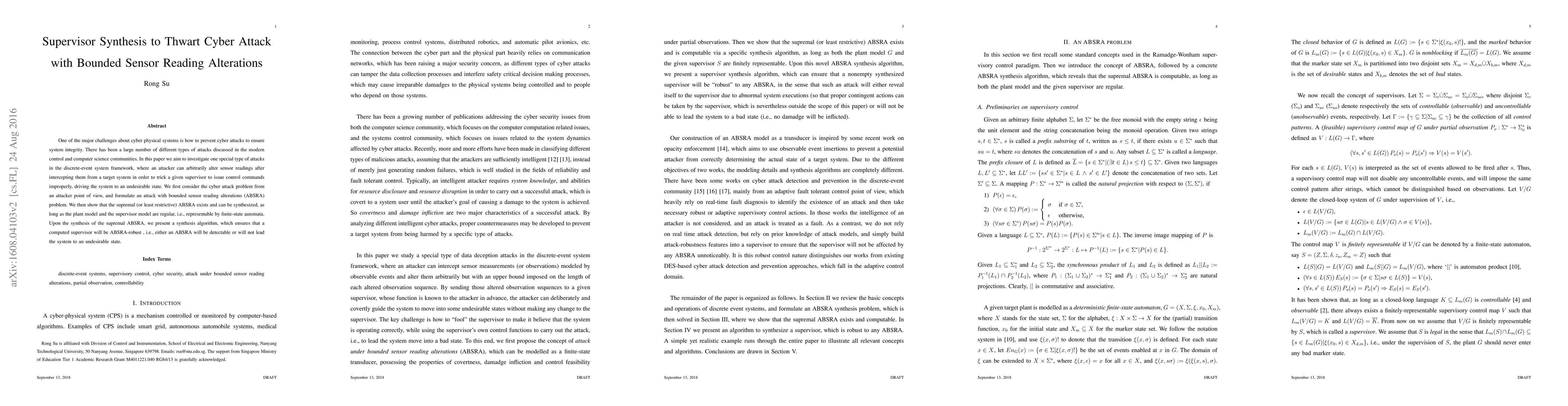 One of the major challenges about cyber physical systems is how to prevent cyber attacks to ensure system integrity. There has been a large number of different types of attacks discussed in the modern control and computer science communities. In this paper we aim to investigate one special type of attacks in the discrete-event system framework, where an attacker can arbitrarily alter sensor readings after intercepting them from a target system in order to trick a given supervisor to issue control commands improperly, driving the system to an undesirable state. We first consider the cyber attack problem from an attacker point of view, and formulate an attack with bounded sensor reading alterations (ABSRA) problem. We then show that the supremal (or least restrictive) ABSRA exists and can be synthesized, as long as the plant model and the supervisor model are regular, i.e., representable by finite-state automata. Upon the synthesis of the supremal ABSRA, we present a synthesis algorithm, which ensures that a computed supervisor will be ABSRA-robust , i.e., either an ABSRA will be detectable or will not lead the system to an undesirable state.
