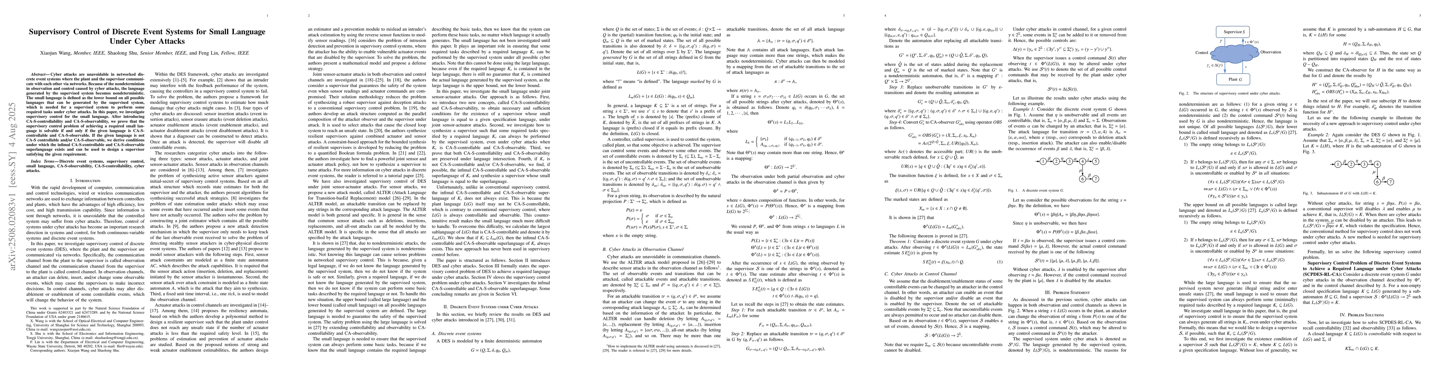 Cyber attacks are unavoidable in networked discrete event systems where the plant and the supervisor communicate with each other via networks. Because of the nondeterminism in observation and control caused by cyber attacks, the language generated by the supervised system becomes nondeterministic. The small language is defined as the lower bound on all possible languages that can be generated by the supervised system, which is needed for a supervised system to perform some required tasks under cyber attacks. In this paper, we investigate supervisory control for the small language. After introducing CA-S-controllability and CA-S-observability, we prove that the supervisory control problem of achieving a required small language is solvable if and only if the given language is CA-Scontrollable and CA-S-observable. If the given language is not CA-S controllable and/or CA-S-observable, we derive conditions under which the infimal CA-S-controllable and CA-S-observable superlanguage exists and can be used to design a supervisor satisfying the given requirement.
