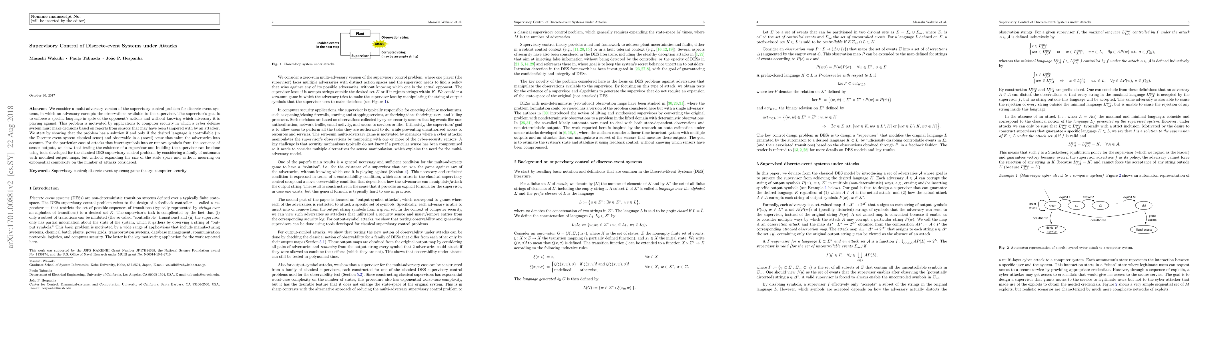 We consider a multi-adversary version of the supervisory control problem for discrete-event systems, in which an adversary corrupts the observations available to the supervisor. The supervisor's goal is to enforce a specific language in spite of the opponent's actions and without knowing which adversary it is playing against. This problem is motivated by applications to computer security in which a cyber defense system must make decisions based on reports from sensors that may have been tampered with by an attacker. We start by showing that the problem has a solution if and only if the desired language is controllable (in the Discrete event system classical sense) and observable in a (novel) sense that takes the adversaries into account. For the particular case of attacks that insert symbols into or remove symbols from the sequence of sensor outputs, we show that testing the existence of a supervisor and building the supervisor can be done using tools developed for the classical DES supervisory control problem, by considering a family of automata with modified output maps, but without expanding the size of the state space and without incurring on exponential complexity on the number of attacks considered., we construct observers that are robust against attacks and lead to an automaton representation of the supervisor. We also develop a test for observability under such replacement-removal attacks by using the so-called product automata.