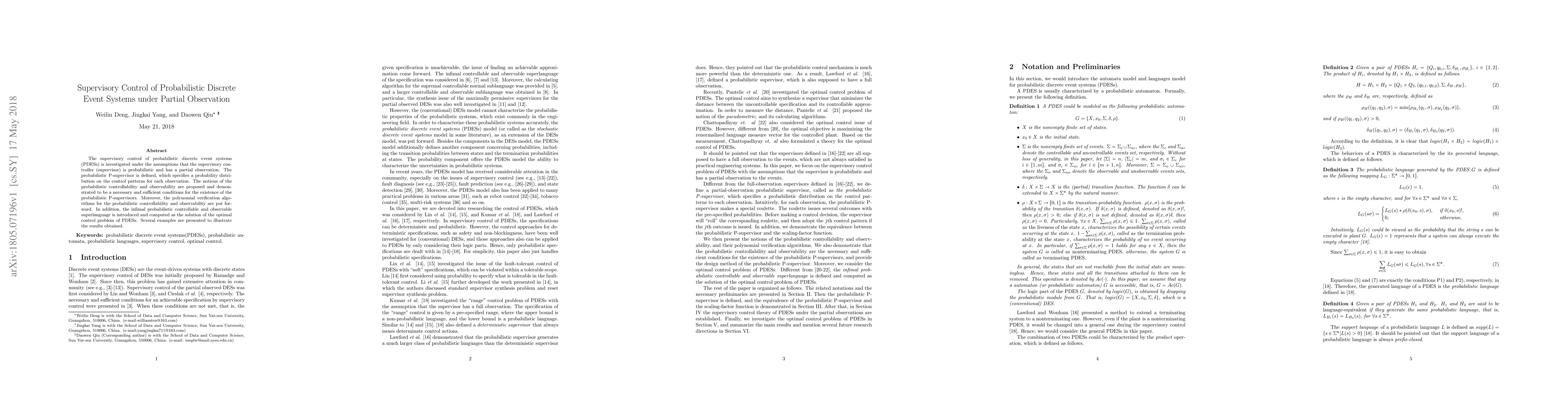 This paper investigates supervisory control strategies for probabilistic discrete event systems (PDESs) where the supervisor operates under partial observation and probabilistic decision-making. It introduces the concept of a probabilistic P-supervisor and establishes probabilistic controllability and observability as necessary conditions for its existence, along with polynomial verification algorithms for these properties.