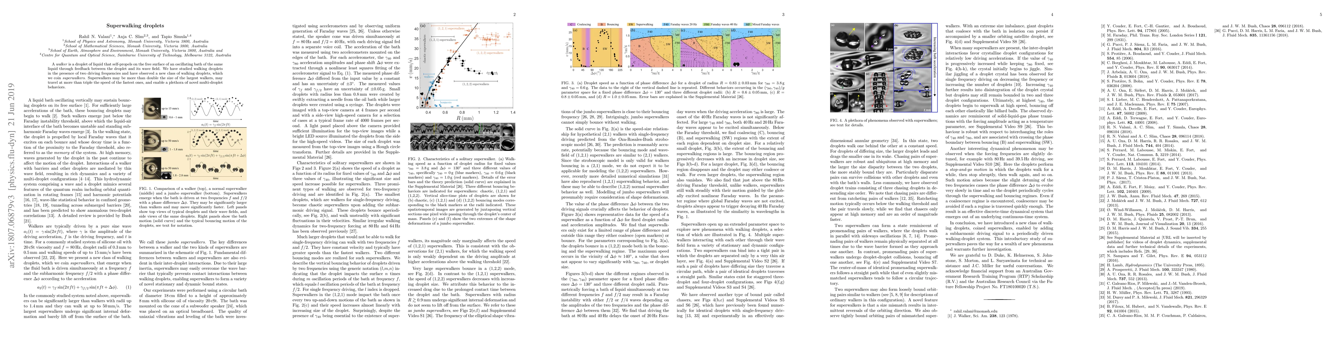 This research explores self-propelled "walker" droplets on oscillating liquid surfaces, discovering a new class termed "superwalkers" that are significantly larger and faster, enabling complex multi-droplet interactions.