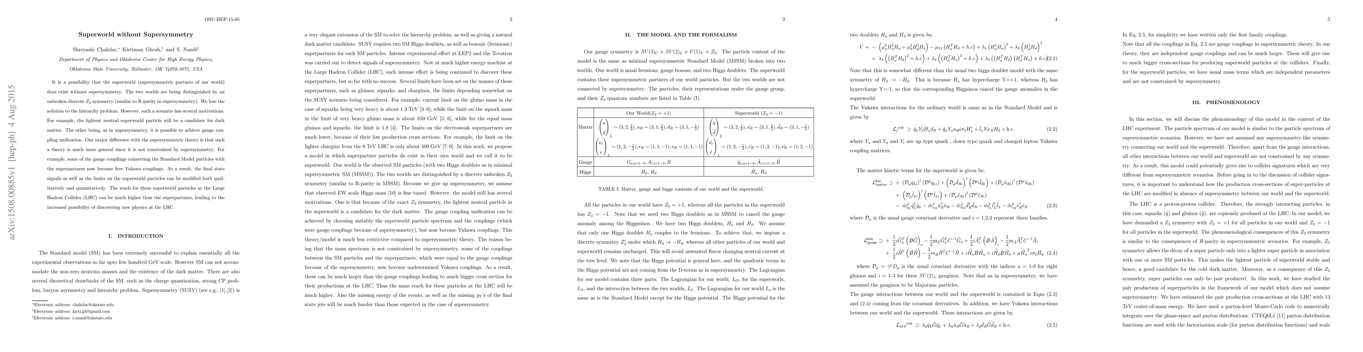 The model introduces a superworld without supersymmetry, distinguished by a $Z_2$ symmetry, leading to novel collider signatures and extended reach for superworld particles at the LHC due to free Yukawa couplings.