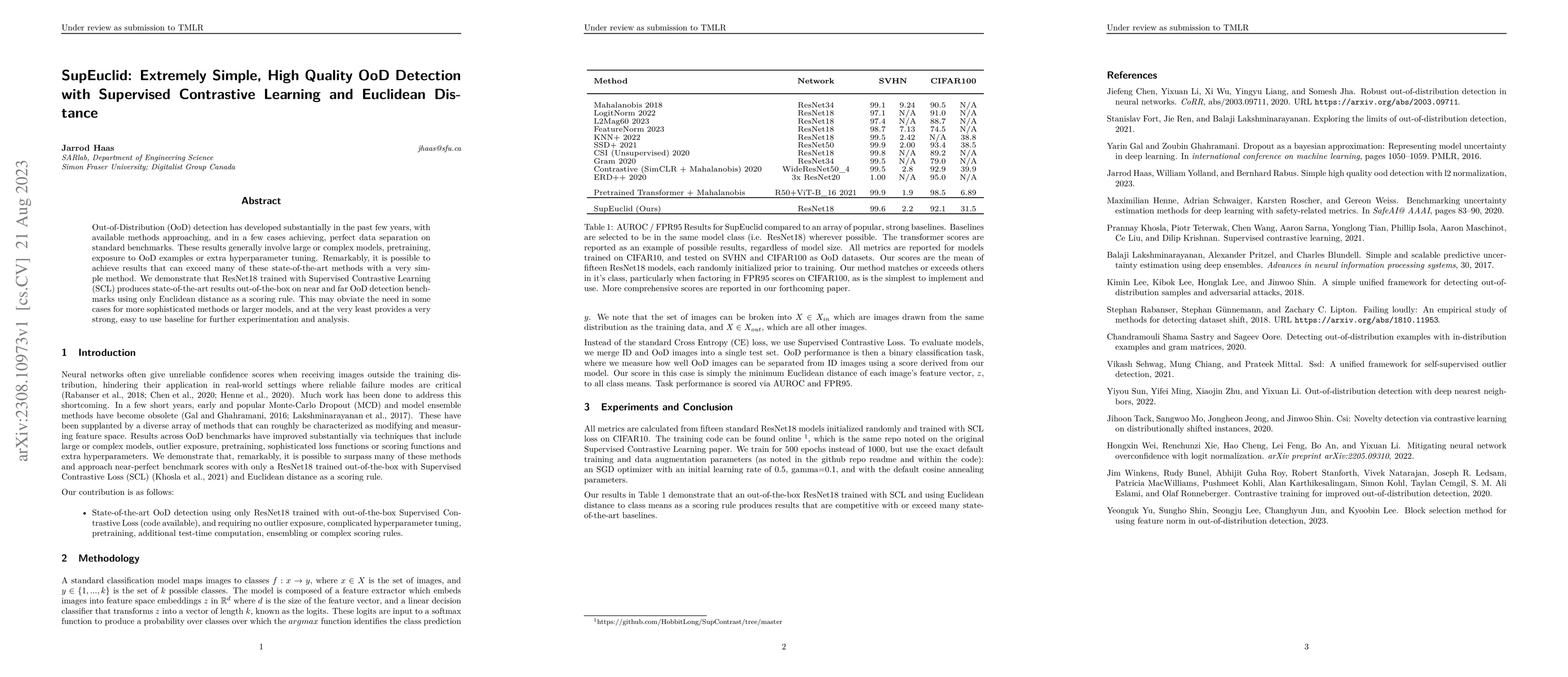 SupEuclid employs a simple ResNet18 model trained with Supervised Contrastive Learning to achieve high-quality out-of-distribution detection using only Euclidean distance, outperforming many complex state-of-the-art methods without requiring extra hyperparameter tuning or pretraining. This straightforward approach provides a strong baseline for further research in OoD detection.