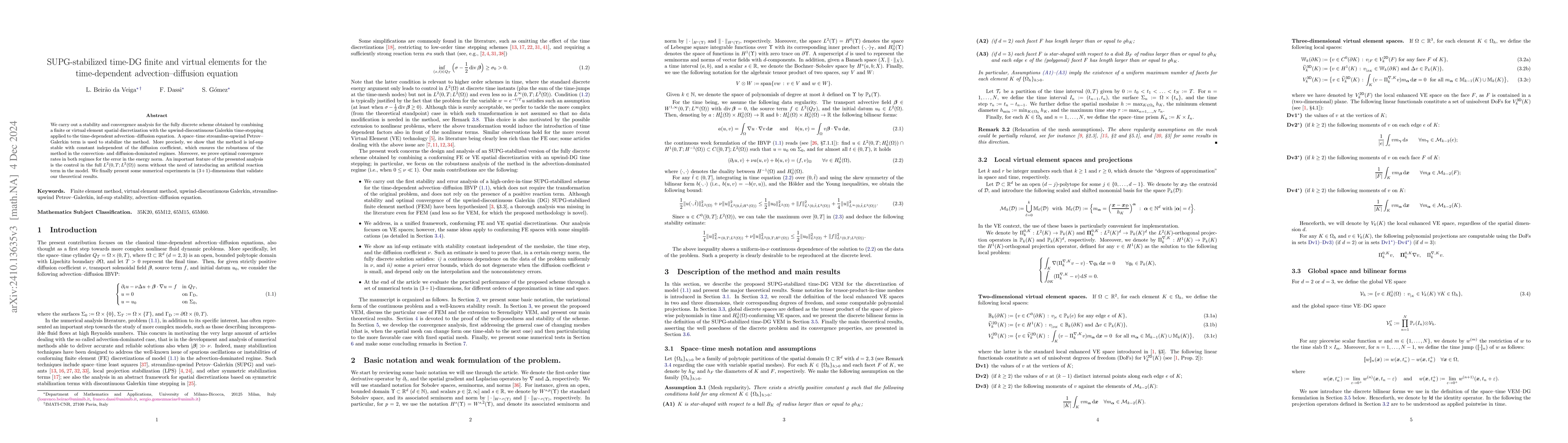 This paper investigates a SUPG-stabilized time-DG finite/virtual element method for solving the time-dependent advection-diffusion equation, demonstrating stability, convergence, and robustness across convection- and diffusion-dominated regimes without requiring an artificial reaction term. Numerical experiments validate theoretical findings.