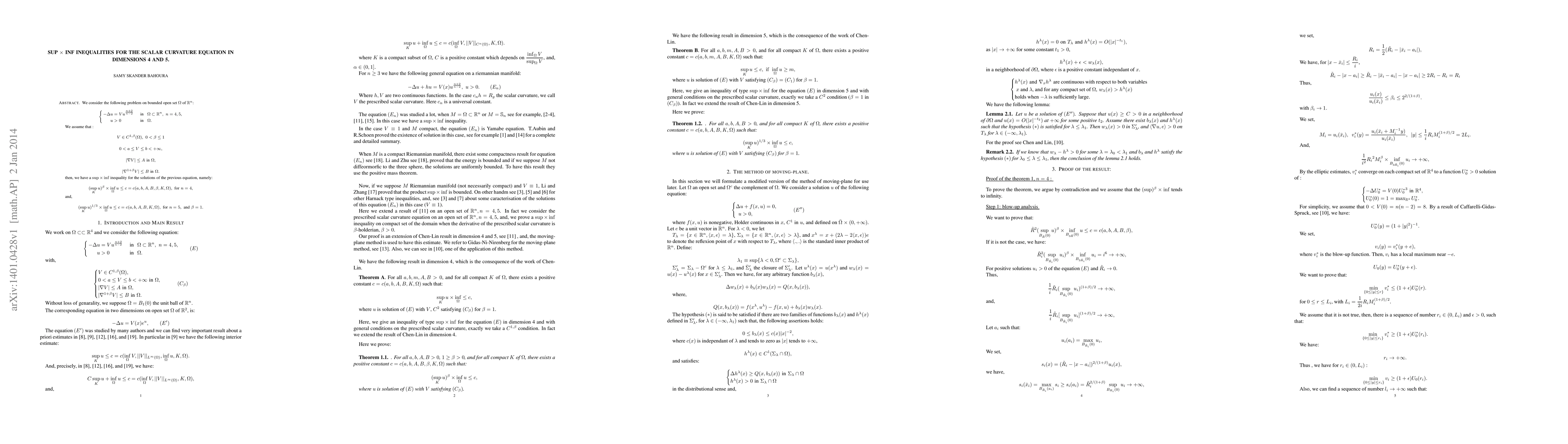 This paper provides estimates of a type sup*inf for scalar curvature equation in dimensions 4 and 5 under certain conditions on prescribed curvature.