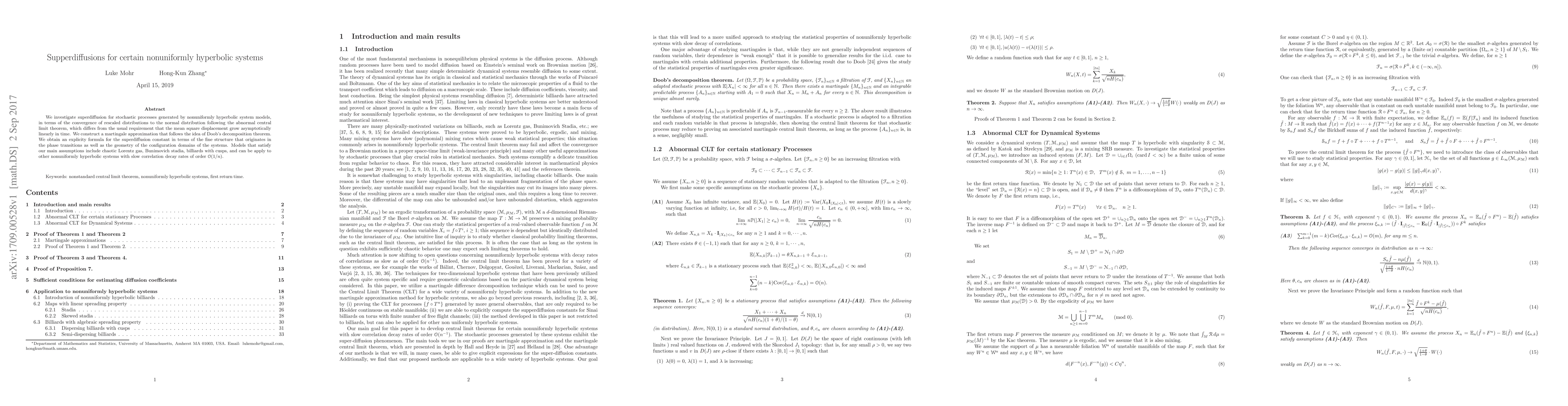 We investigate superdiffusion for stochastic processes generated by nonuniformly hyperbolic system models, in terms of the convergence of rescaled distributions to the normal distribution following the abnormal central limit theorem, which differs from the usual requirement that the mean square displacement grow asymptotically linearly in time. We construct a martingale approximation that follows the idea of Doob's decomposition theorem. We obtain an explicity formula for the superdiffusion constant in terms of the fine structure that originates in the phase transitions as well as the geometry of the configuration domains of the systems. Models that satisfy our main assumptions include chaotic Lorentz gas, Bunimovich stadia, billiards with cusps, and can be apply to other nonuniformly hyperbolic systems with slow correlation decay rates of order $\cO(1/n)$.