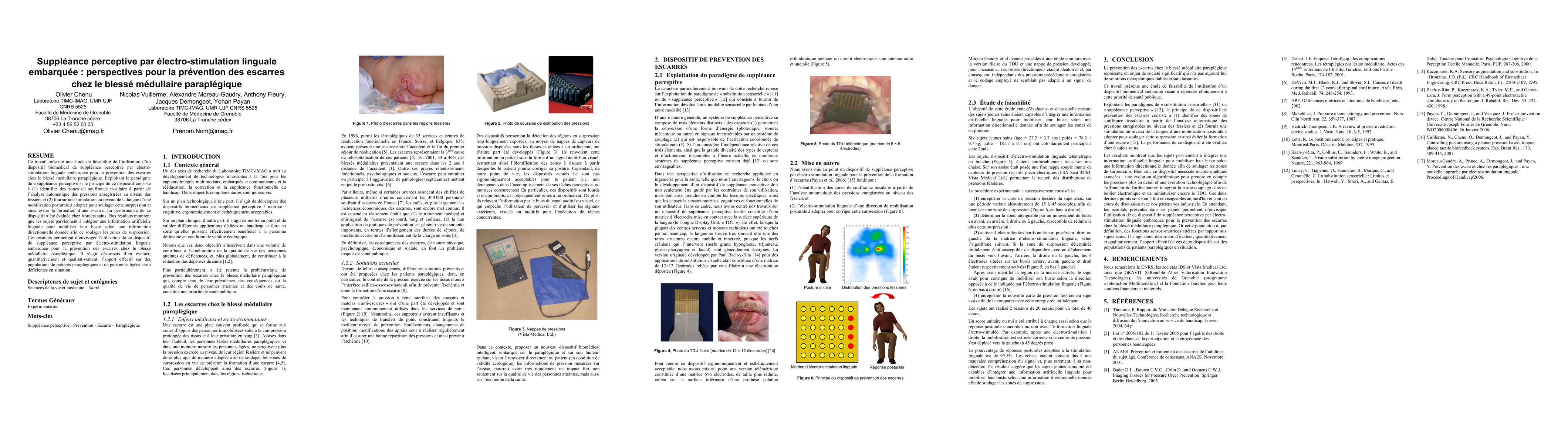 We introduce the innovative technologies, based on the concept of "sensory substitution", we are developing in the fields of biomedical engineering and human disability. Precisely, our goal is to design, develop and validate practical assistive biomedical and/or technical devices and/or rehabilitating procedures for persons with disabilities, using artificial tongue-placed tactile biofeedback systems. This paper proposes an application for pressure sores prevention in case of spinal cord injuries (persons with paraplegia, or tetraplegia).