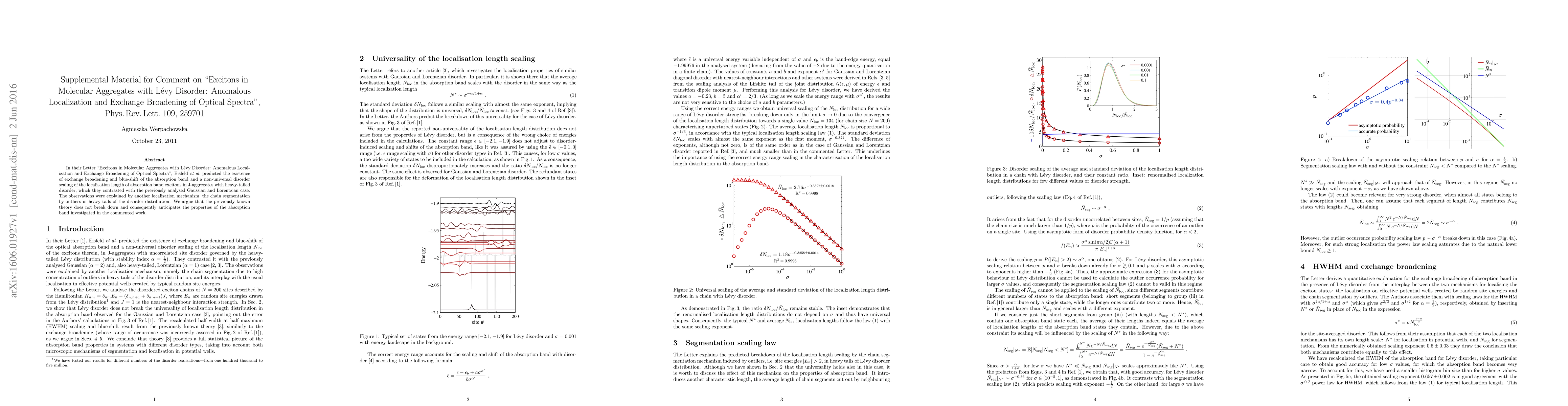 In their Letter "Excitons in Molecular Aggregates with Levy Disorder: Anomalous Localization and Exchange Broadening of Optical Spectra", Eisfeld et al. predicted the existence of exchange broadening and blue-shift of the absorption band and a non-universal disorder scaling of the localisation length of absorption band excitons in J-aggregates with heavy-tailed disorder, which they contrasted with the previously analysed Gaussian and Lorentzian case. The observations were explained by another localisation mechanism, the chain segmentation by outliers in heavy tails of the disorder distribution. We argue that the previously known theory does not break down and consequently anticipates the properties of the absorption band investigated in the commented work.