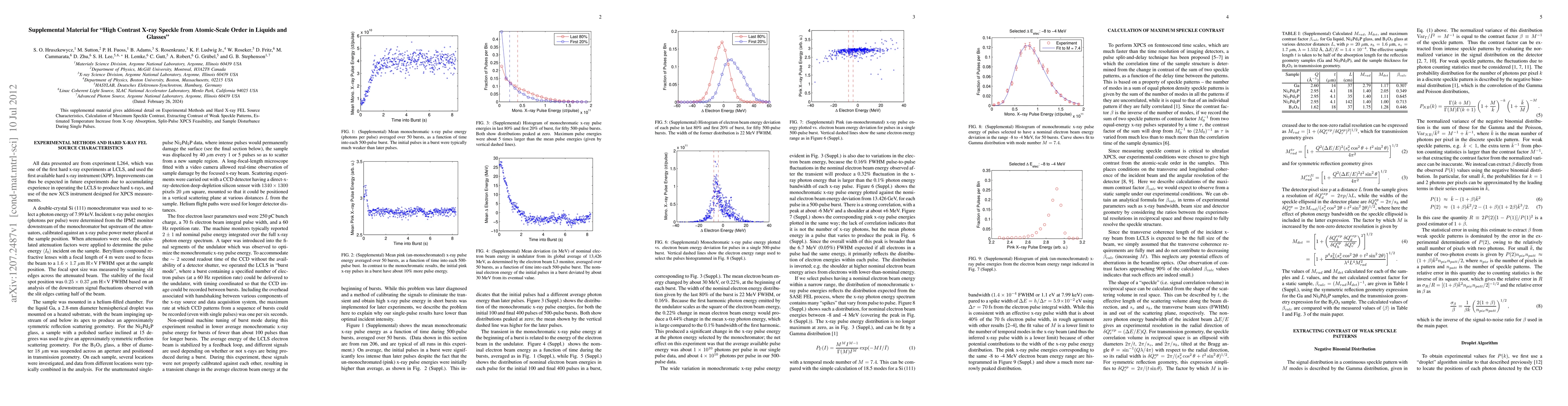 This supplemental material provides detailed experimental methods and characteristics of the hard X-ray FEL source, calculations for maximum speckle contrast, techniques for extracting contrast from weak patterns, estimated temperature increases due to X-ray absorption, and considerations for split-pulse X-ray speckle and sample disturbance during single pulses.