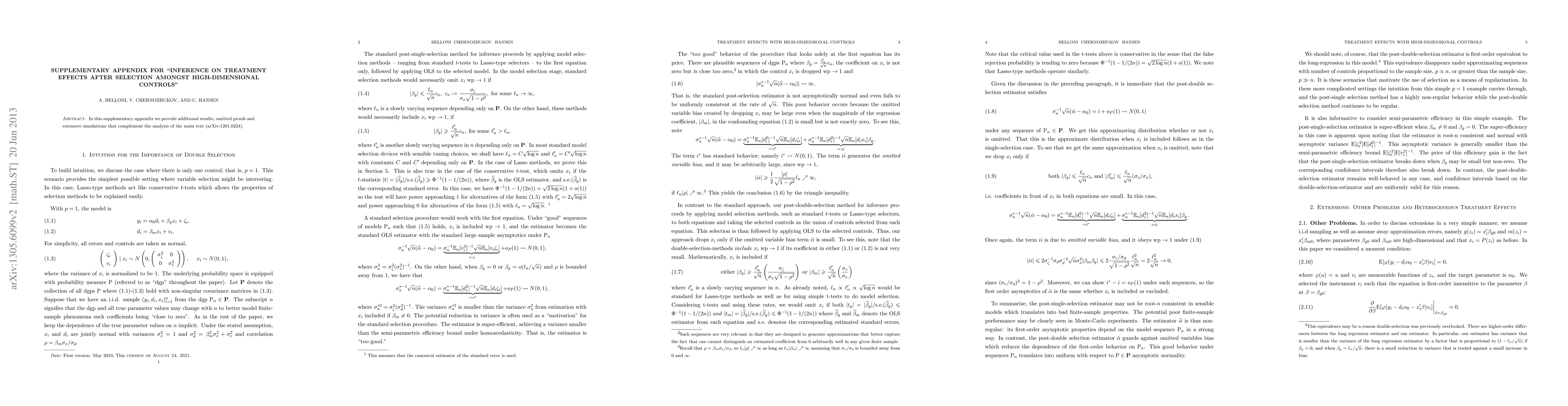 This supplementary appendix offers additional results, detailed simulations, and omitted proofs that complement the main analysis in the paper on inferring treatment effects after selection among high-dimensional controls. It serves as an extension to the primary study, providing deeper insights and validation.