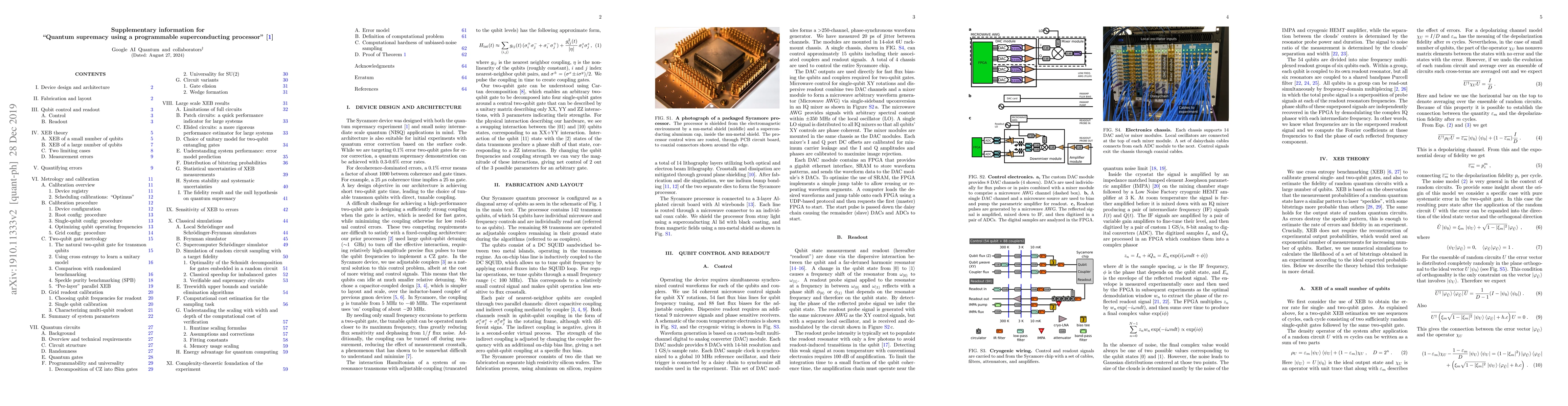 This is an updated version of supplementary information to accompany "Quantum supremacy using a programmable superconducting processor", an article published in the October 24, 2019 issue of Nature. The main article is freely available at https://www.nature.com/articles/s41586-019-1666-5. Summary of changes since arXiv:1910.11333v1 (submitted 23 Oct 2019): added URL for qFlex source code; added Erratum section; added Figure S41 comparing statistical and total uncertainty for log and linear XEB; new References [1,65]; miscellaneous updates for clarity and style consistency; miscellaneous typographical and formatting corrections.