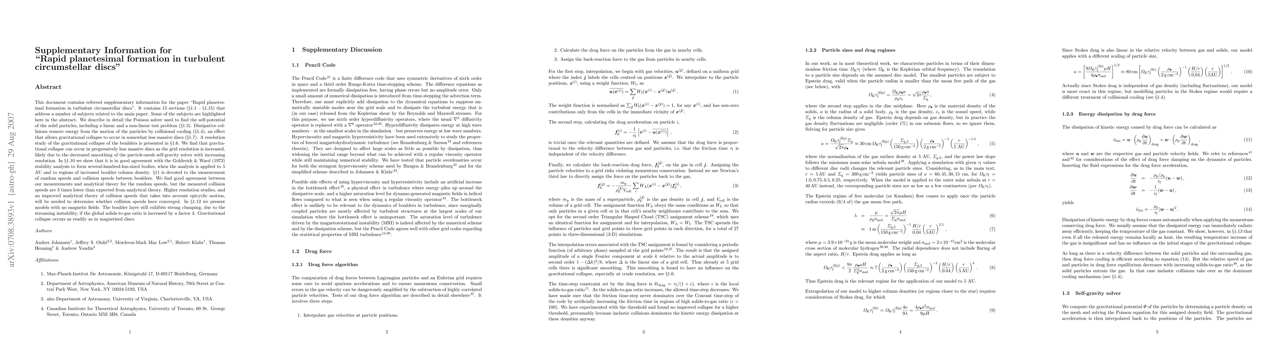 This supplementary document provides detailed information on the mechanisms of rapid planetesimal formation in turbulent circumstellar discs, including the Poisson solver for self-potential, collisional cooling effects, and gravitational collapse studies. It also discusses the impact of resolution on collapse and the streaming instability in the absence of magnetic fields.