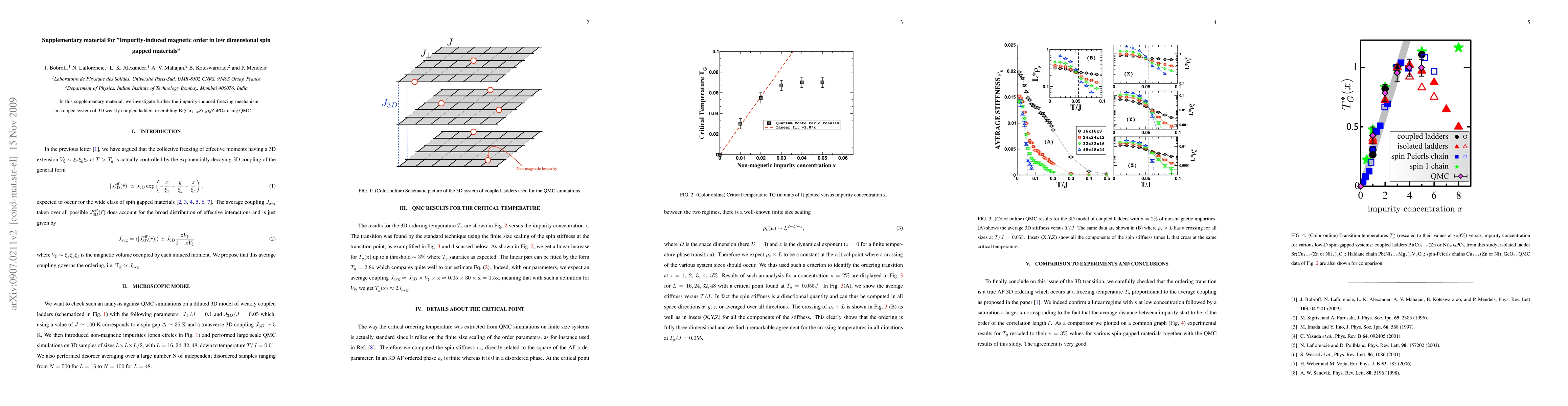 In this supplementary material, we investigate further the impurity-induced freezing mechanism in a doped system of 3D weakly coupled ladders resembling Bi(Cu$_{1-x}$Zn$_x$)$_2$ZnPO$_6$ using large scale Quantum Monte Carlo simulations.