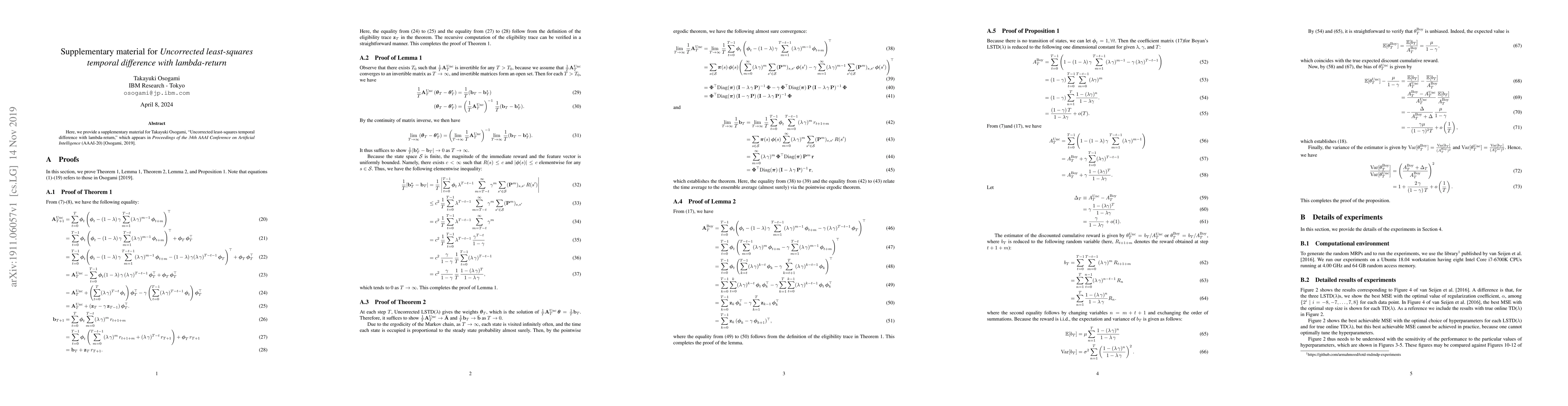 Here, we provide a supplementary material for Takayuki Osogami, "Uncorrected least-squares temporal difference with lambda-return," which appears in {\it Proceedings of the 34th AAAI Conference on Artificial Intelligence} (AAAI-20).