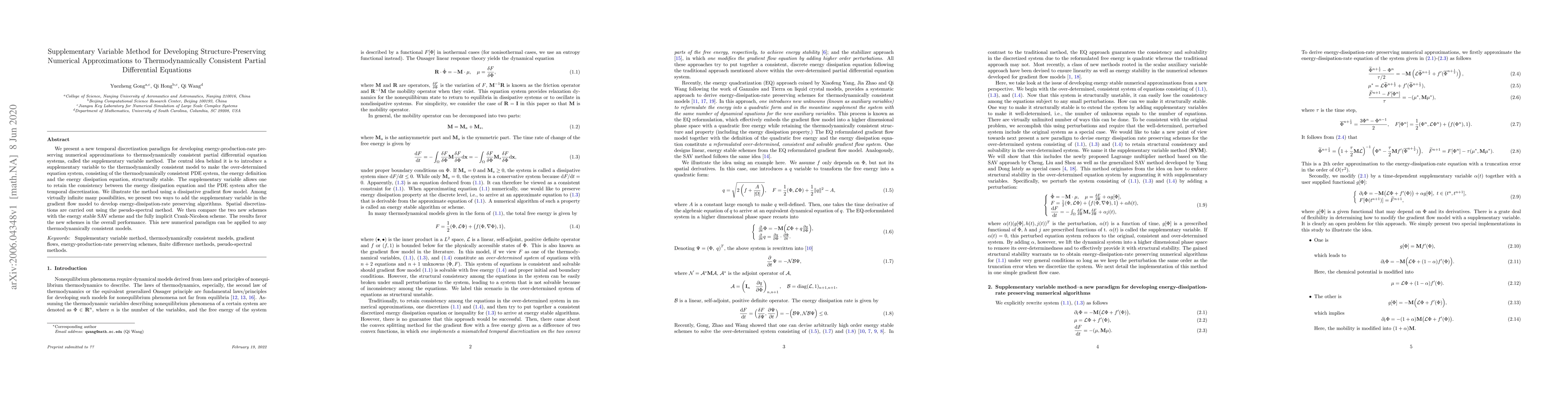 The paper introduces the supplementary variable method for temporal discretization to develop energy-preserving numerical approximations for thermodynamically consistent PDE systems. The method introduces a supplementary variable to ensure structural stability and energy consistency post-discretization, illustrated through a dissipative gradient flow model, outperforming existing schemes in performance.