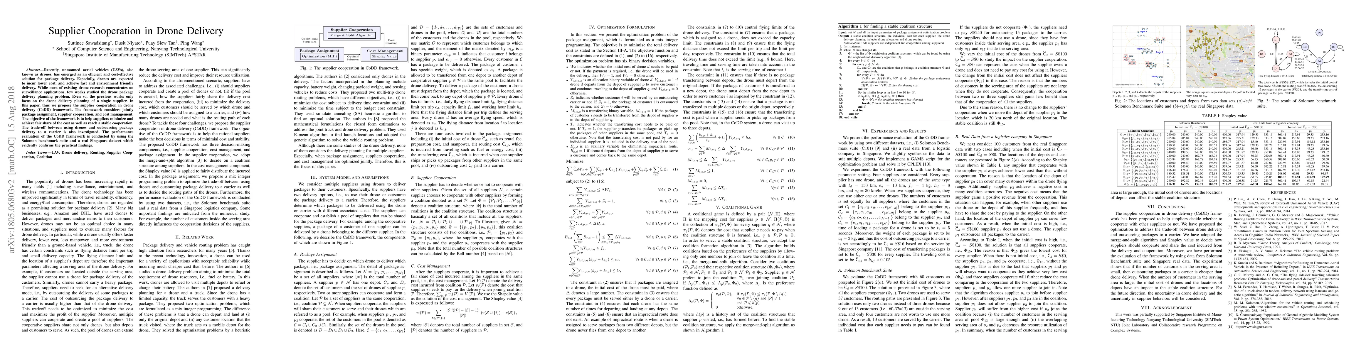 This paper proposes a supplier cooperation in drone delivery (CoDD) framework to optimize package assignment, supplier collaboration, and cost management for multiple suppliers. The framework aims to minimize costs and achieve fair cost-sharing among suppliers, while also evaluating the trade-off between drone delivery and outsourcing to carriers, validated through Solomon benchmark and real Singapore data.